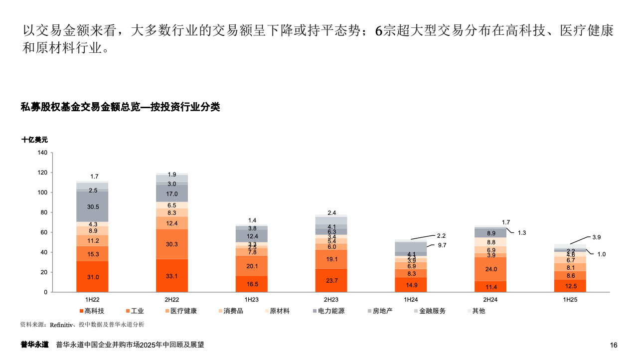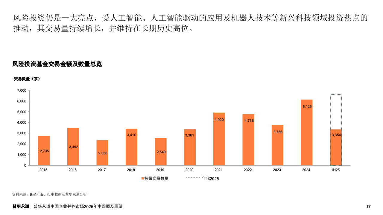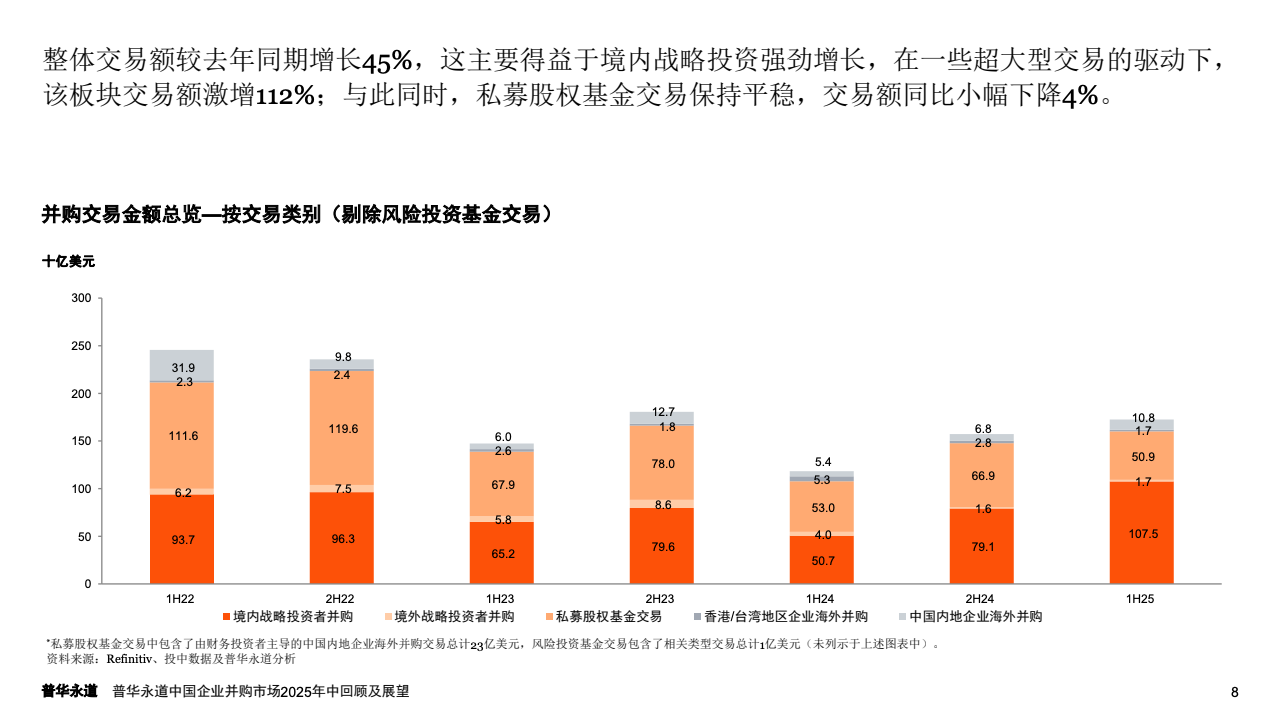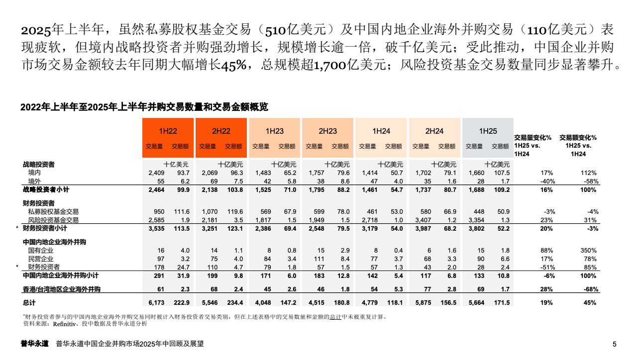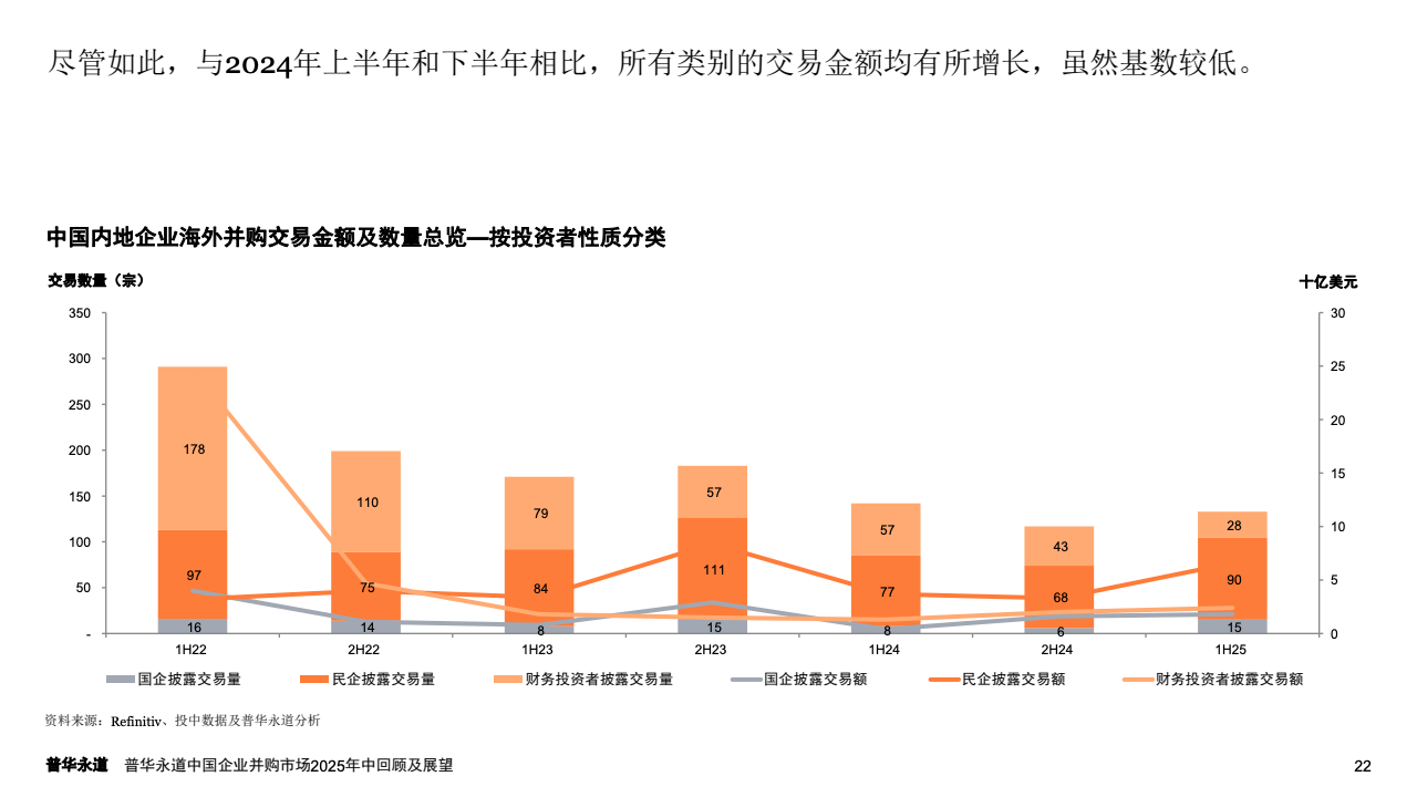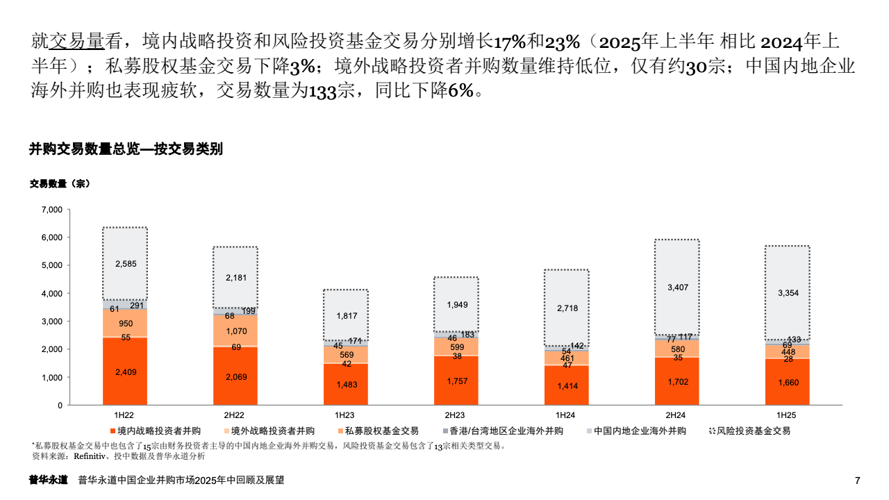 就交易量看,境内战略投资和风险投资基金交易分别增长17%和23%(2025年上半年相比2024年上半年);私募股权基金交易下降3%;境外战略投资者并购数量维持低位,仅有约30宗;中国内地企业海外并购也表现疲软,交易数量为133宗,同比下降6%。