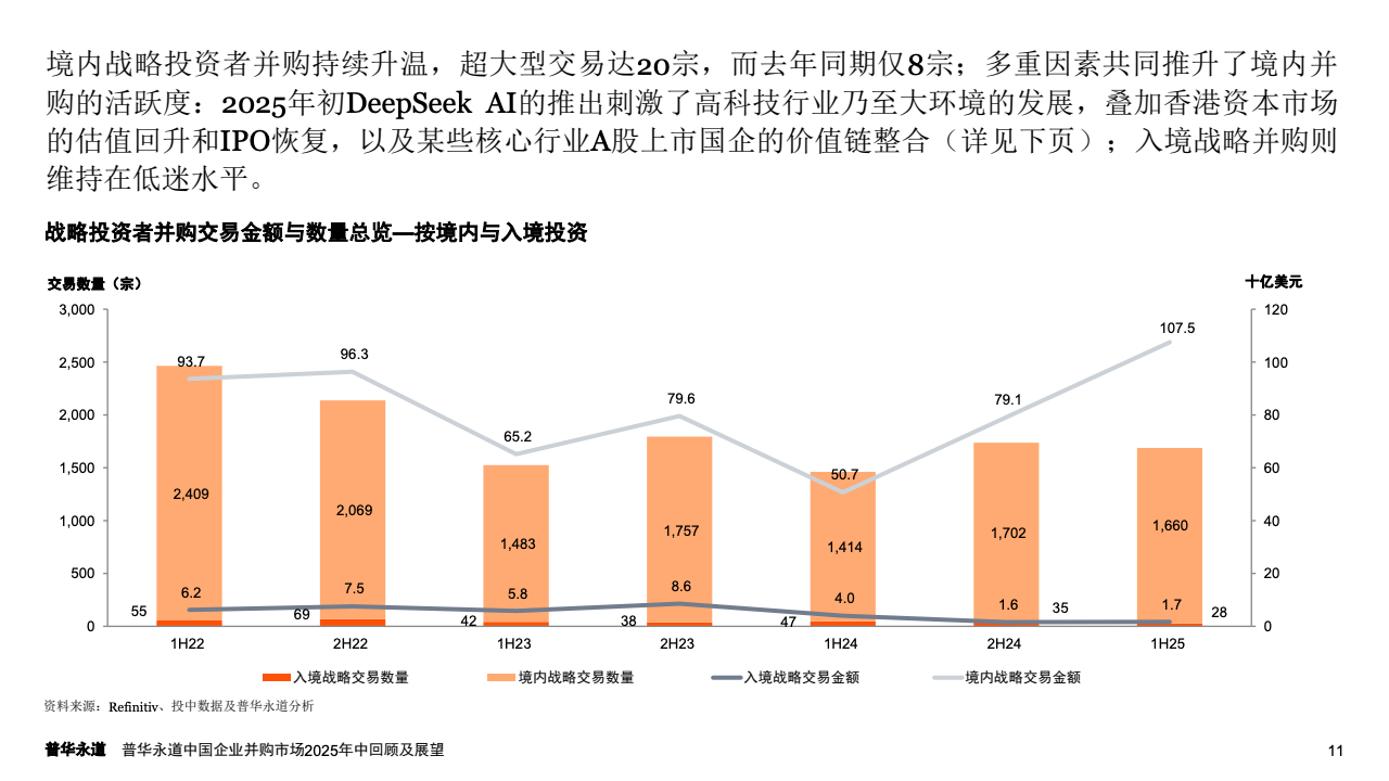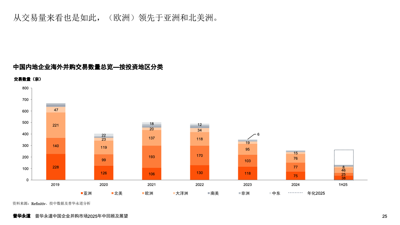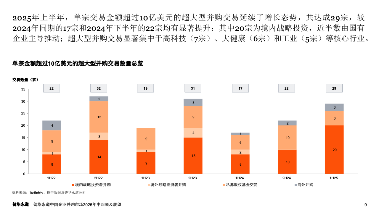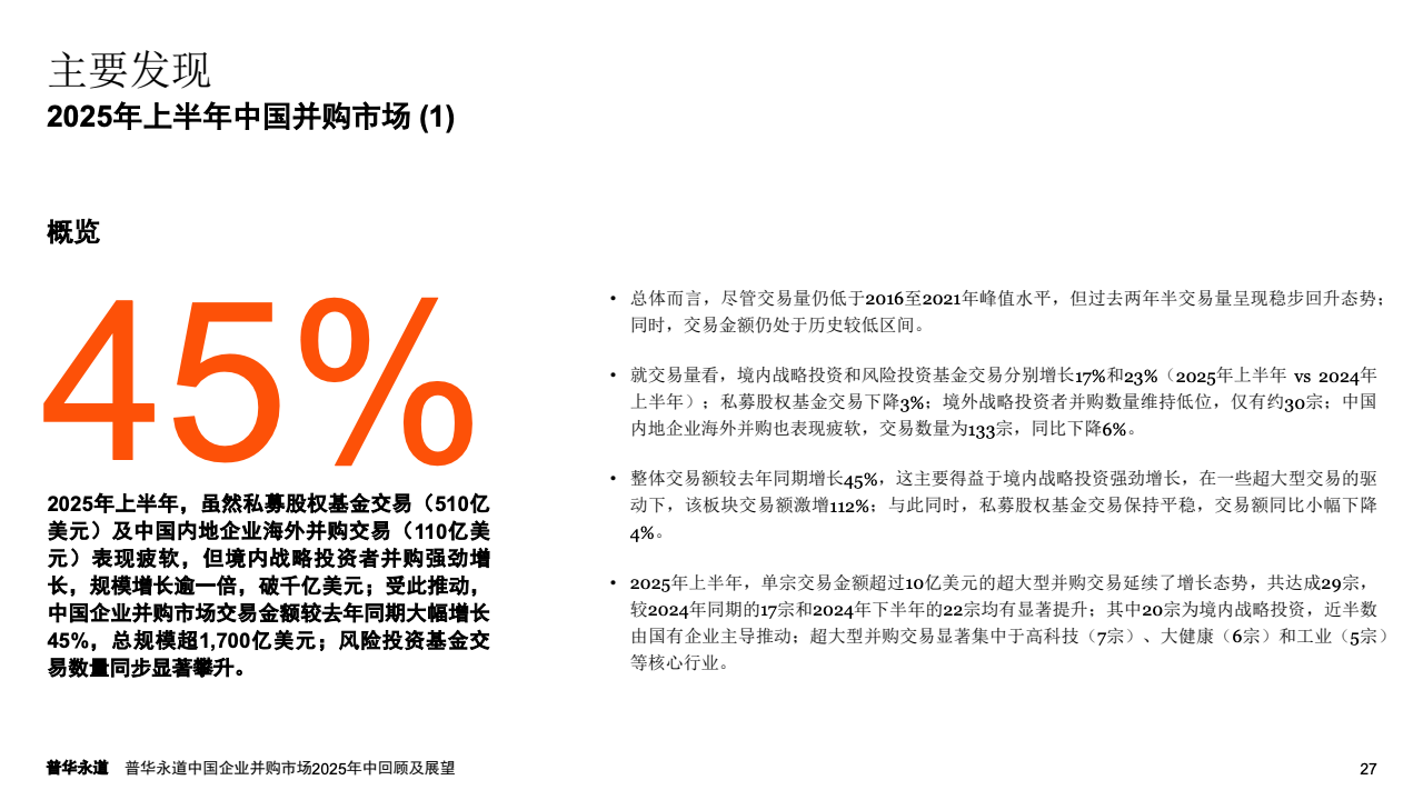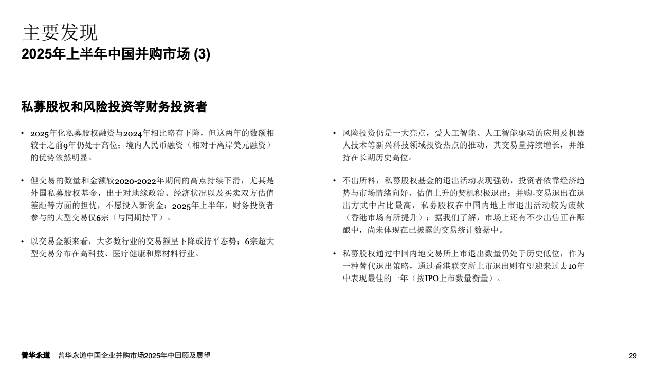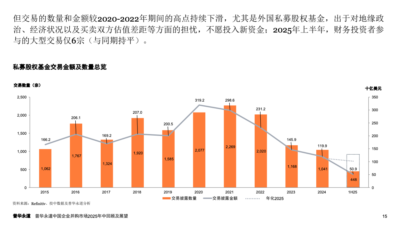 就交易量看,境内战略投资和风险投资基金交易分别增长17%和23%(2025年上半年相比2024年上半年);私募股权基金交易下降3%;境外战略投资者并购数量维持低位,仅有约30宗;中国内地企业海外并购也表现疲软,交易数量为133宗,同比下降6%。