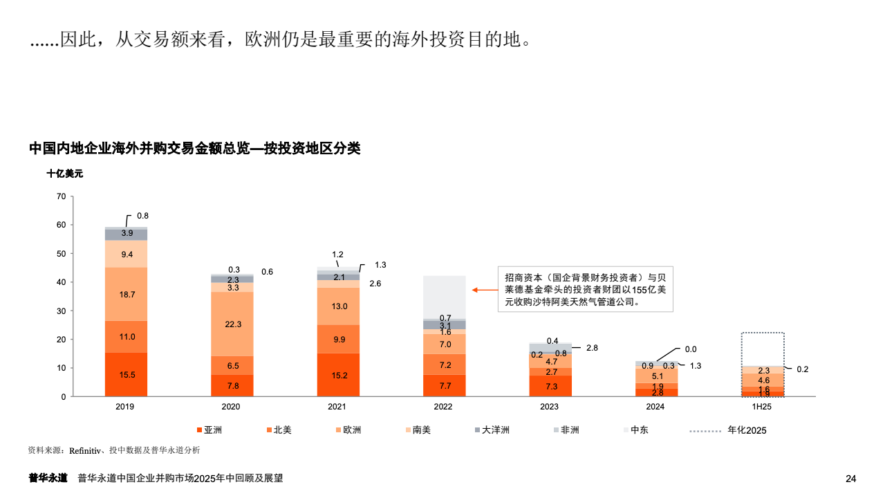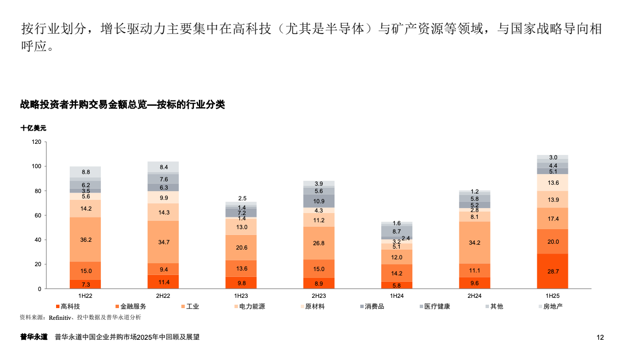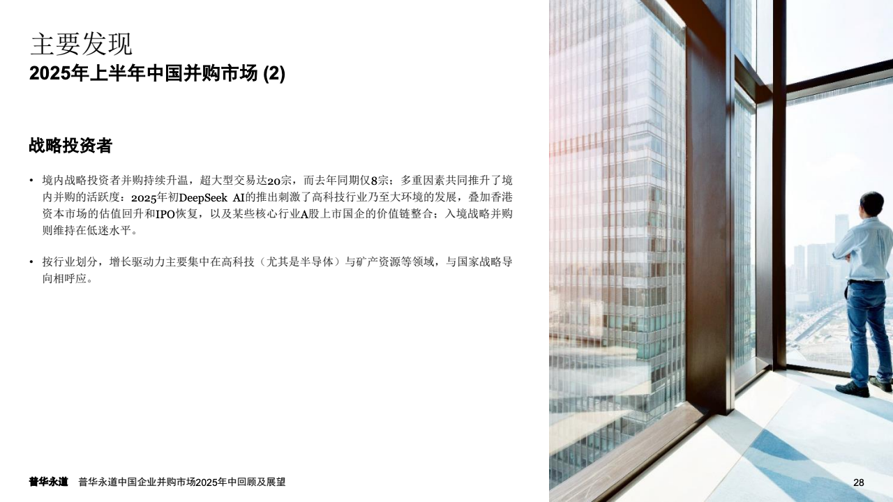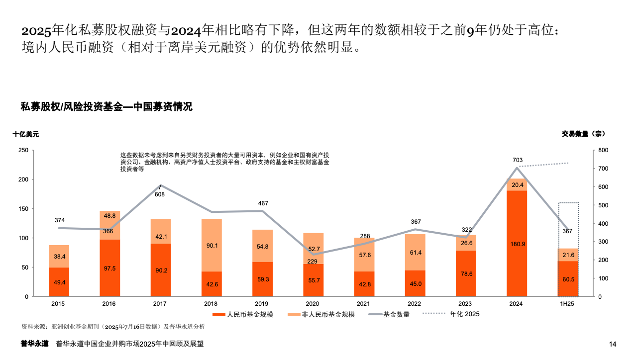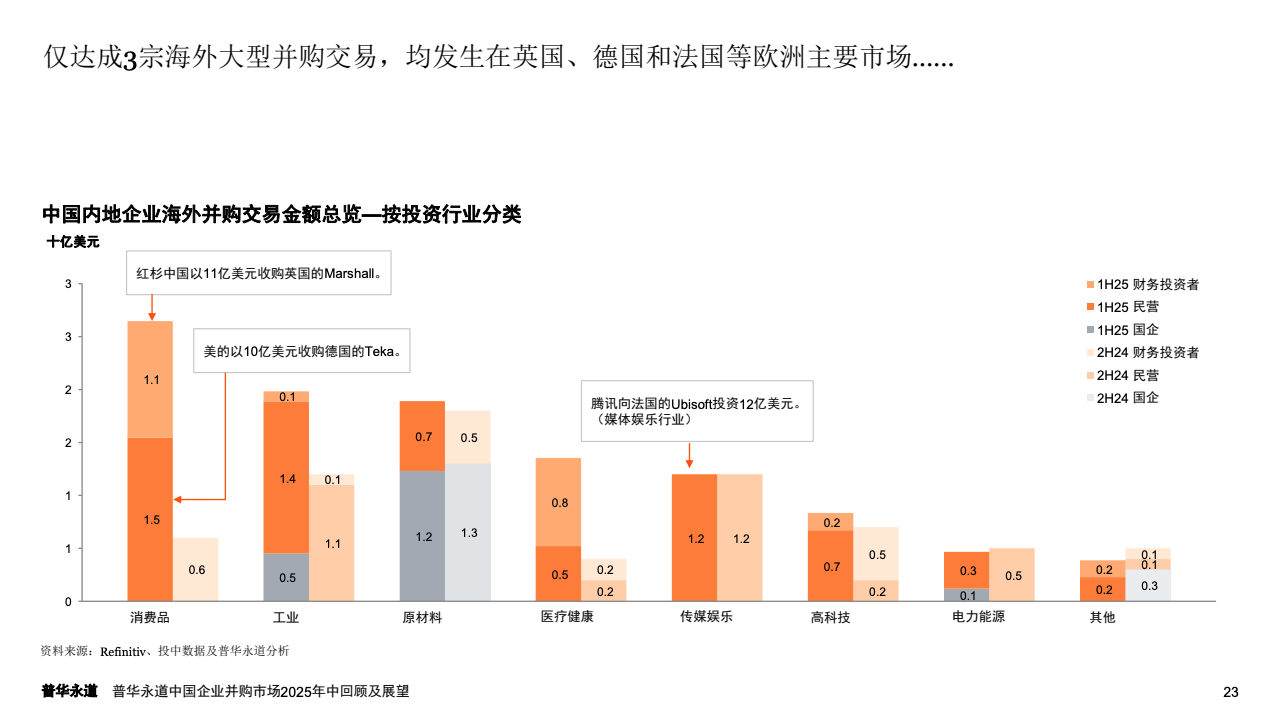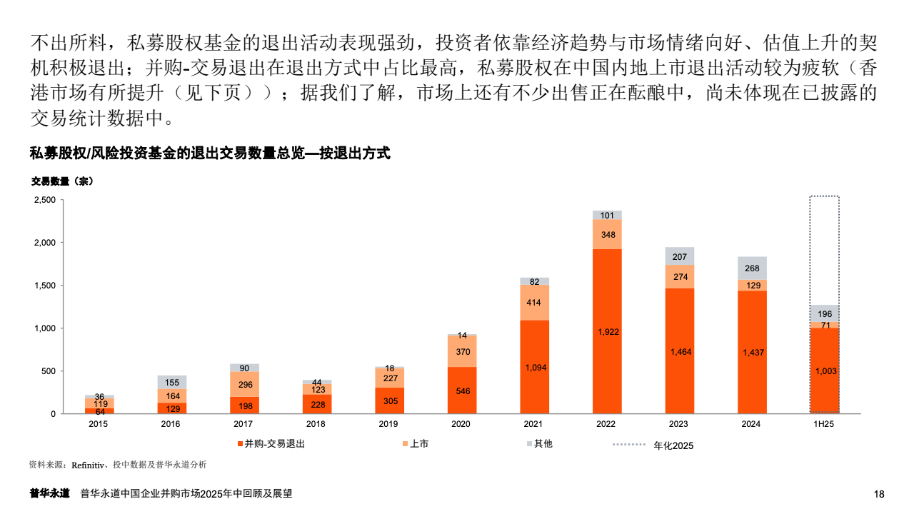 就交易量看,境内战略投资和风险投资基金交易分别增长17%和23%(2025年上半年相比2024年上半年);私募股权基金交易下降3%;境外战略投资者并购数量维持低位,仅有约30宗;中国内地企业海外并购也表现疲软,交易数量为133宗,同比下降6%。