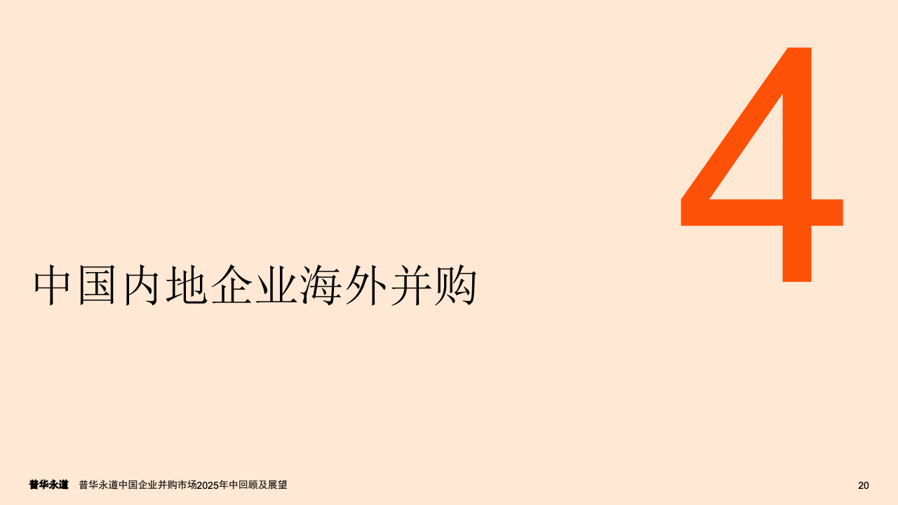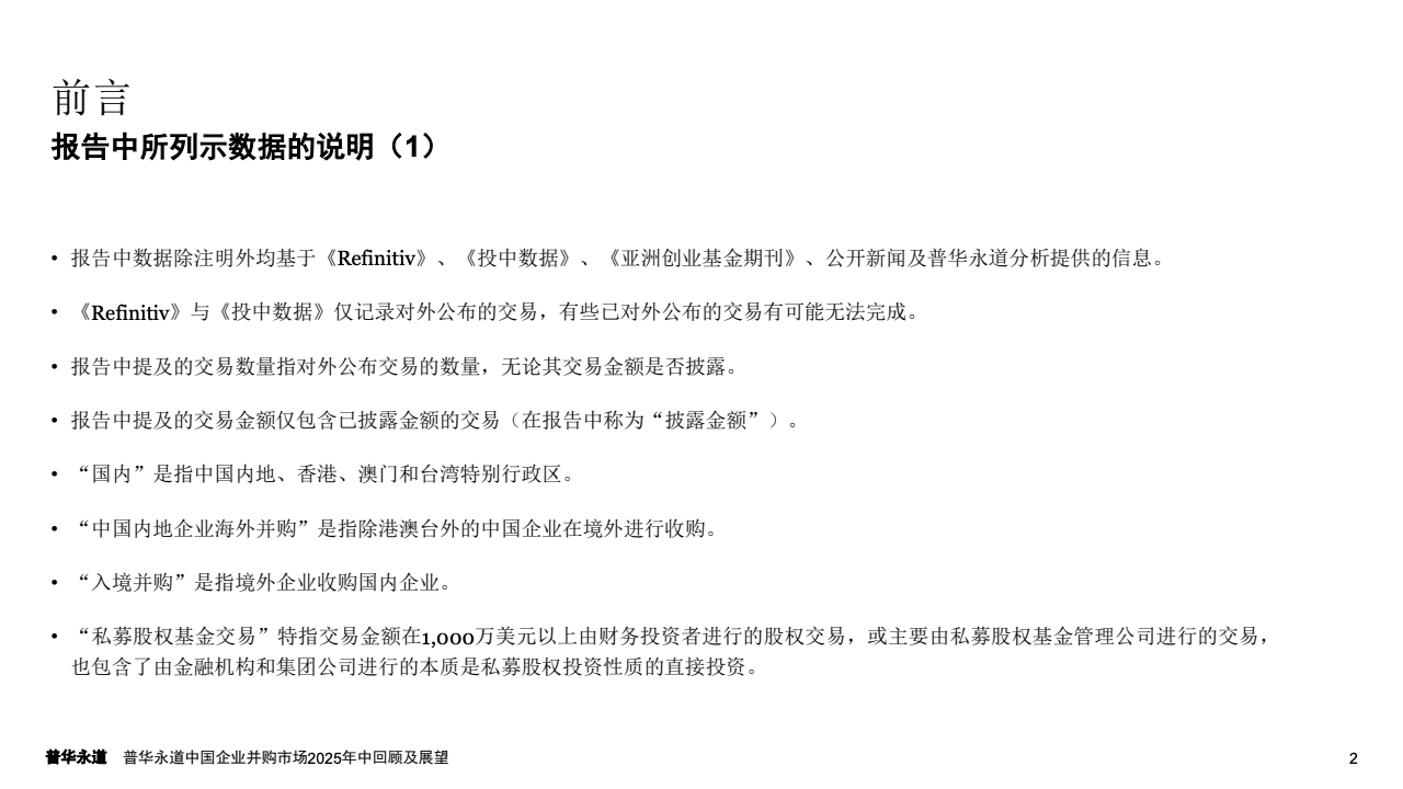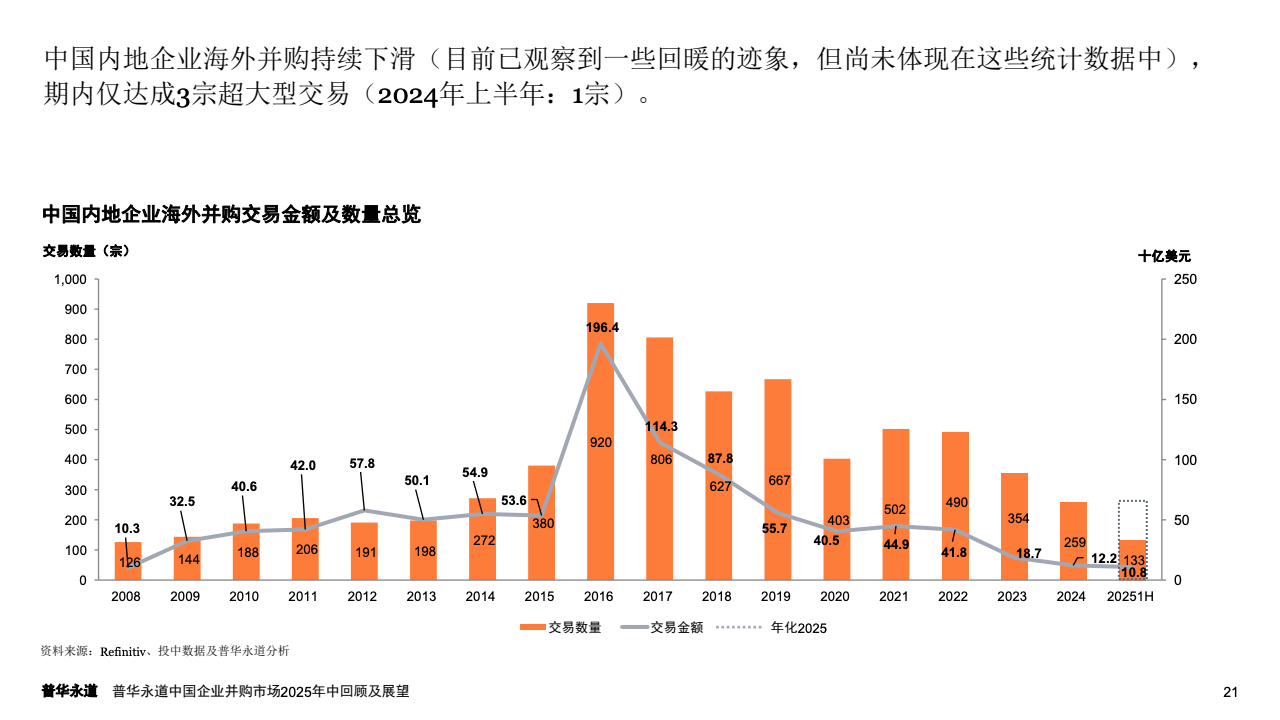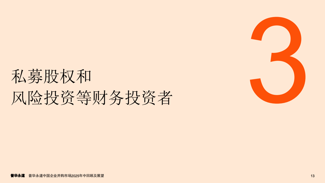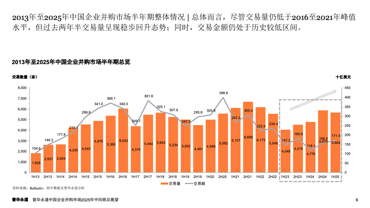 2013年至2025年中国企业并购市场半年期整体情况总体而言,尽管交易量仍低于2016至2021年峰值水平,但过去两年半交易量呈现稳步回升态势;同时,交易金额仍处于历史较低区间。