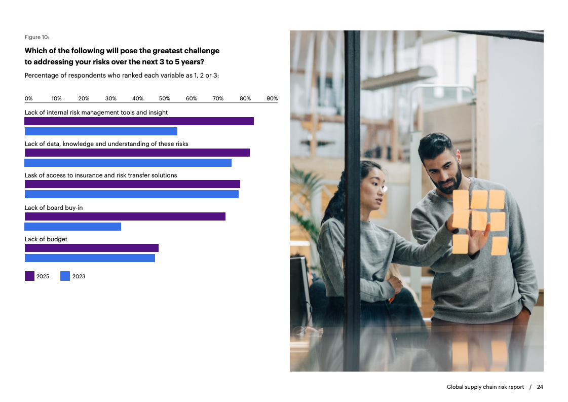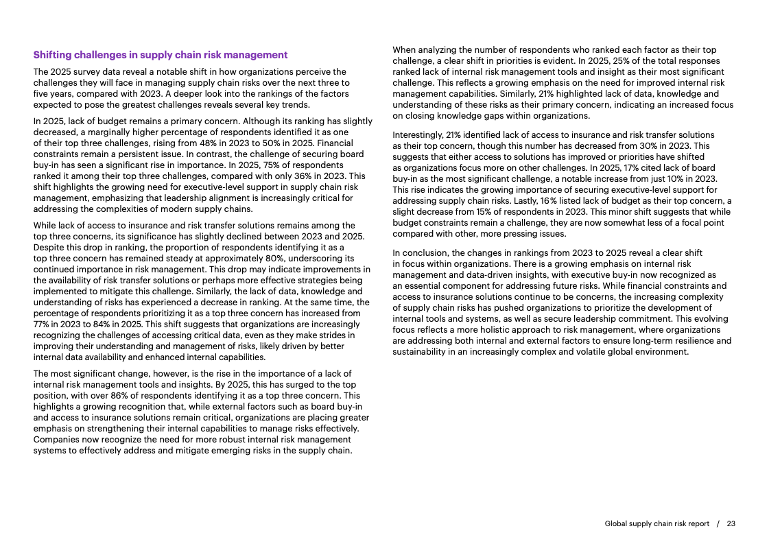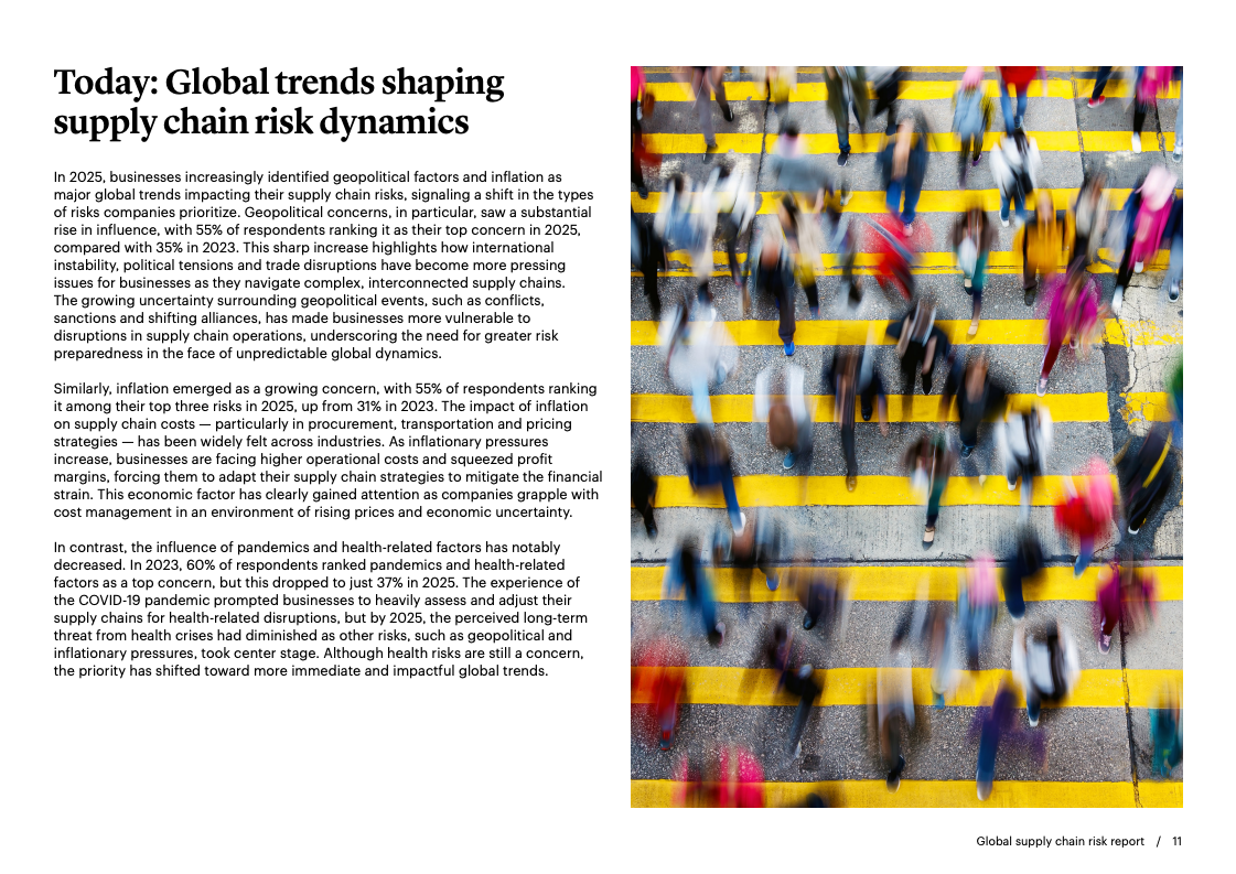 风险优先级的转变尤为显著。将地缘政治列为首要关切的企业比例从2023年的35%激增至2025年的55%。通货膨胀的关注度也从31%同步攀升至55%。与此形成鲜明对比的是,对大流行病等健康相关风险的担忧则从60%大幅回落至37%,表明市场已逐渐适应后疫情时代的常态,并将注意力投向更为紧迫的宏观经济与政治风险。