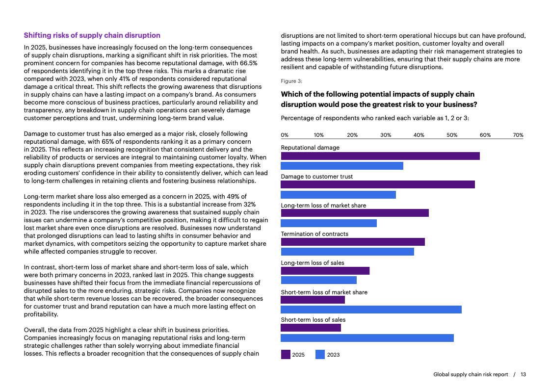 这种转变直接影响了企业对风险后果的评估。短期销售损失已不再是核心忧虑,取而代之的是对无形资产的长期损害。认为声誉损害是最大风险的企业比例从41%飙升至66.5%,对客户信任受损的担忧紧随其后,占比65%。同时,对长期市场份额流失的顾虑也从32%增至49%,反映出企业风险管理思维正从战术性止损向战略性品牌与市场地位保护演进。