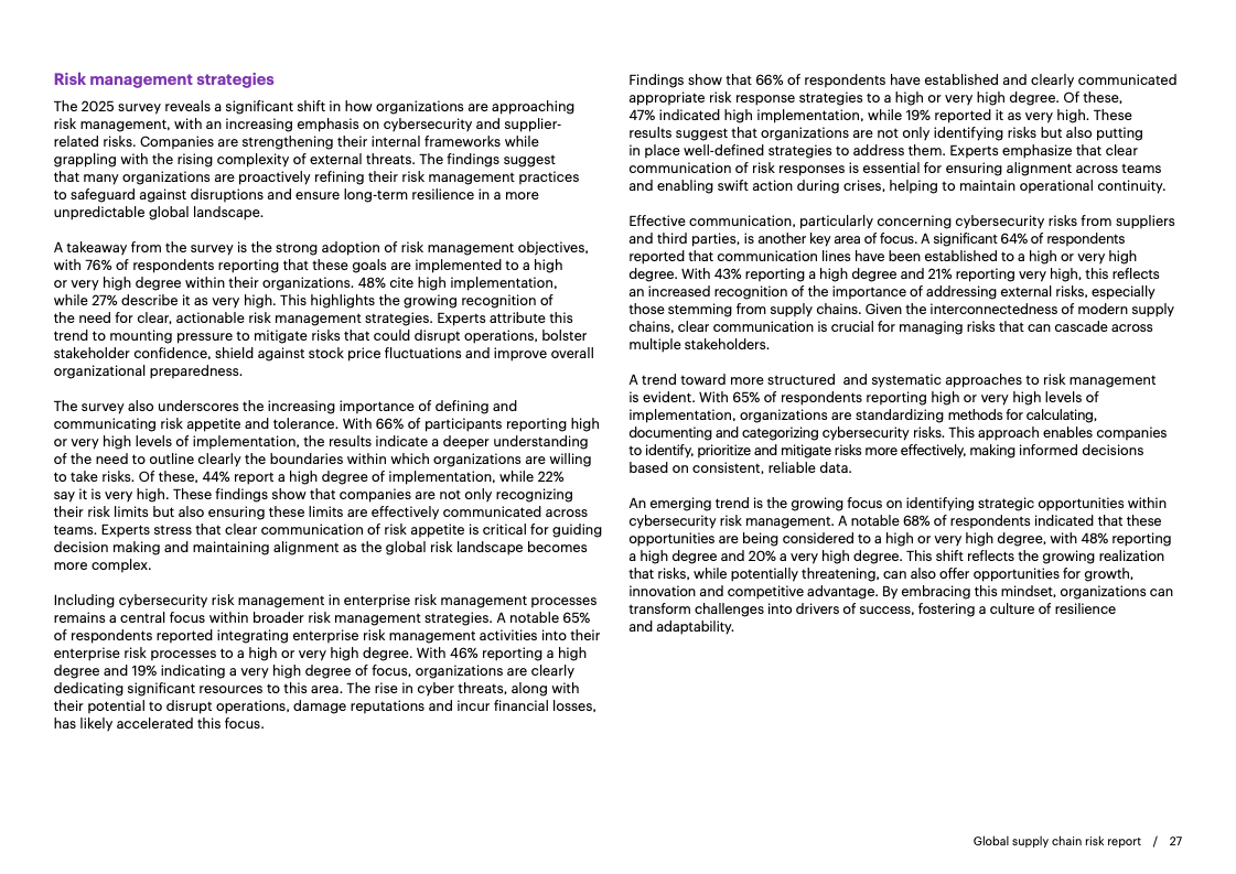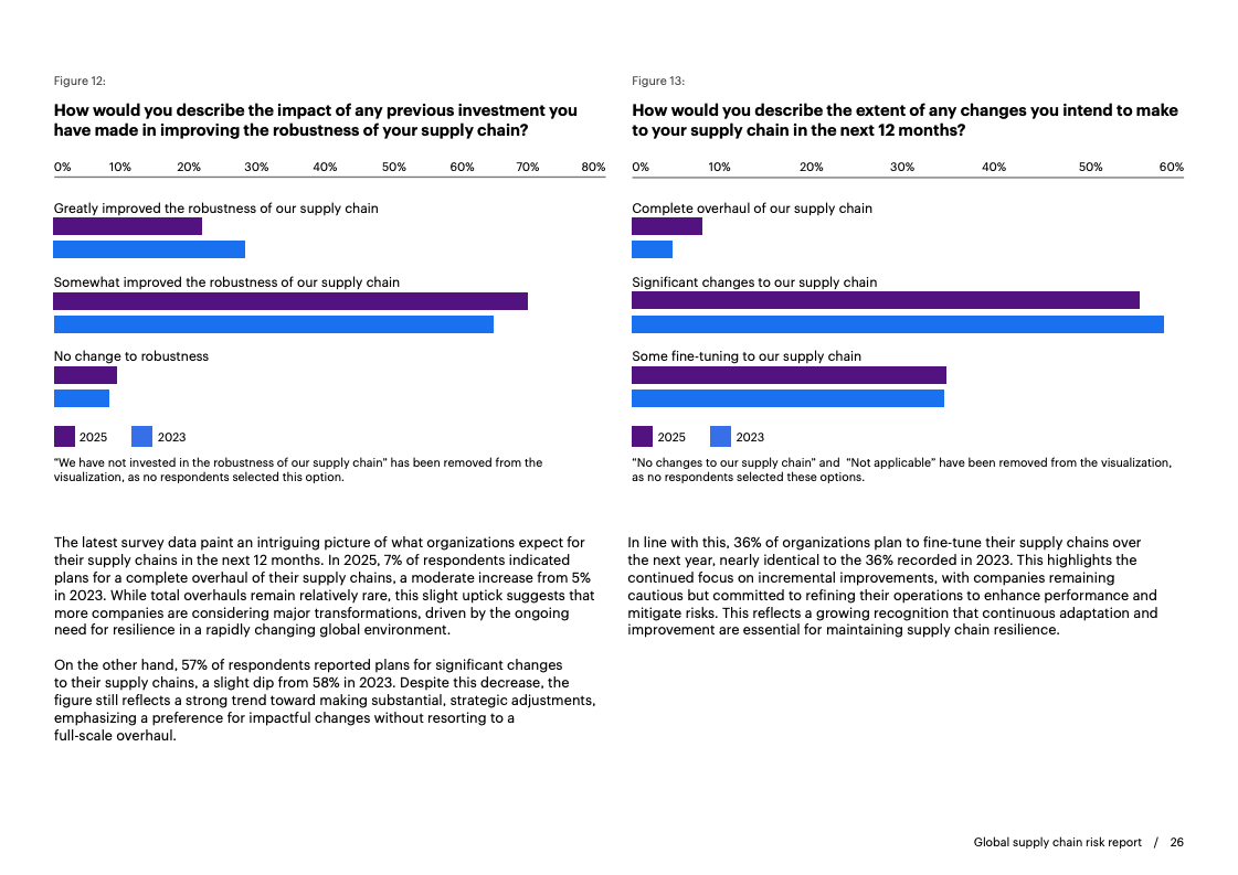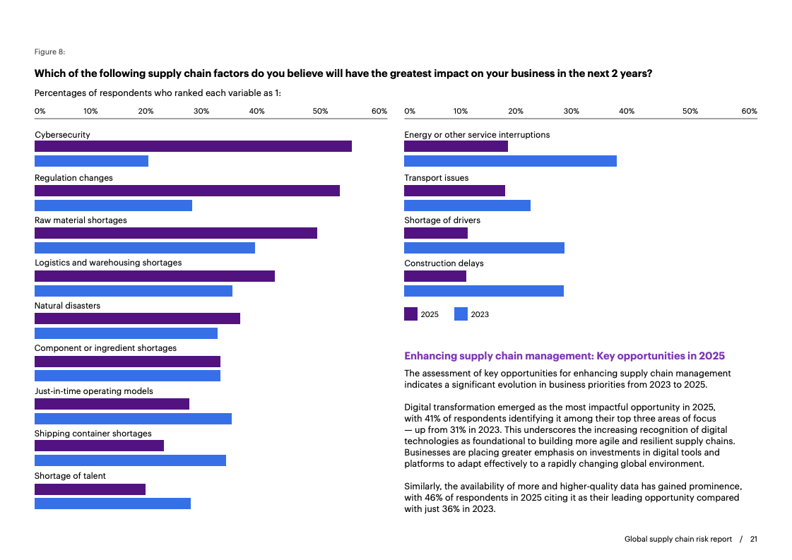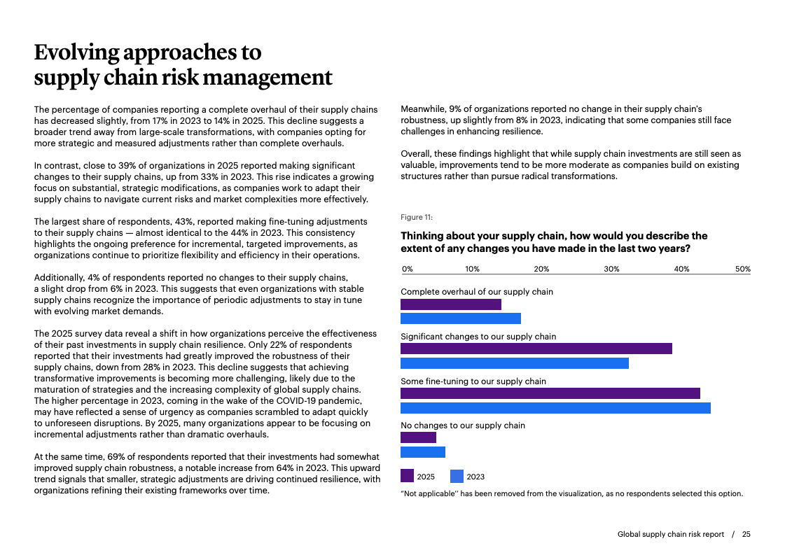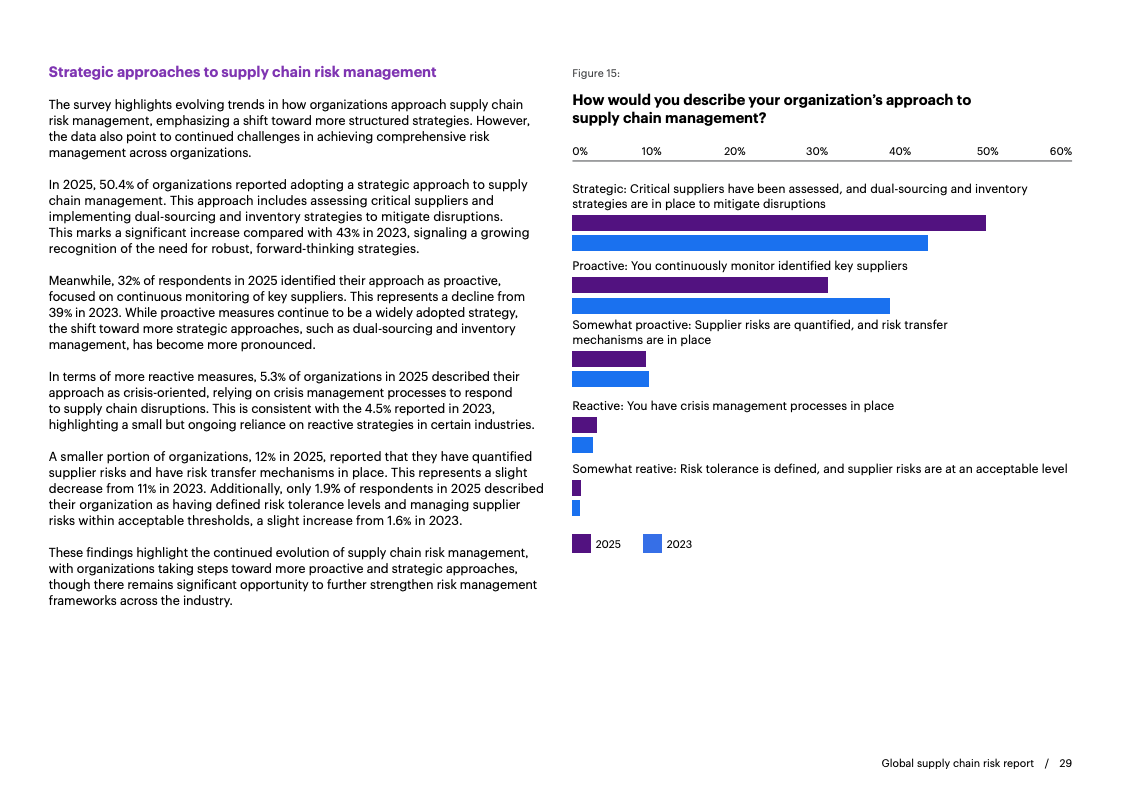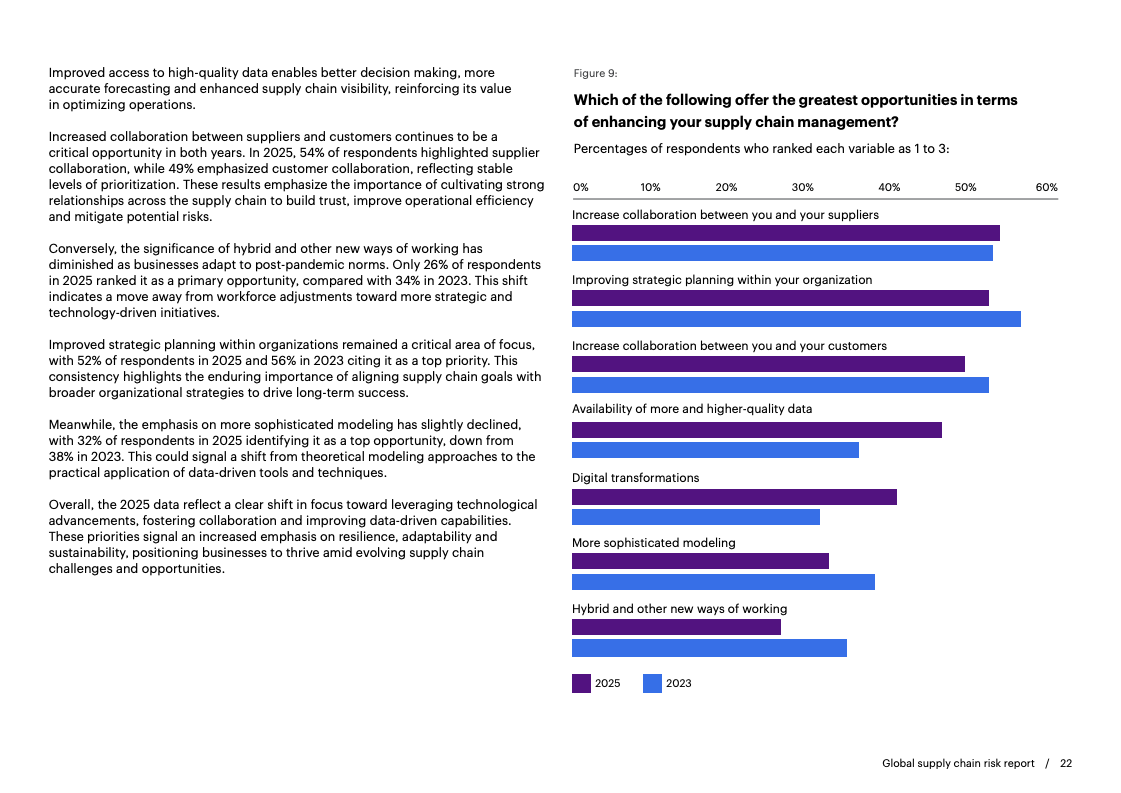 为应对这一系列变化,企业的风险管理策略正从成本驱动转向韧性优先。对离岸外包(Offshoring)的依赖度从26%降至15%,显示出全球化布局的回撤。取而代之的是对改善数据质量与共享(从43%增至58%)以及深化供应商关系(从54%增至60%)的战略倾斜,凸显了以数据驱动和协同合作为核心的供应链韧性建设思路。