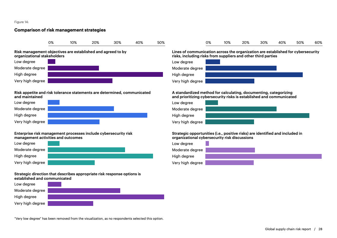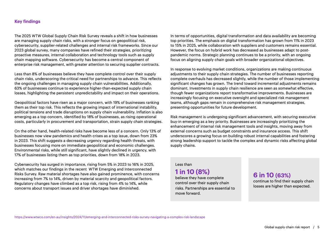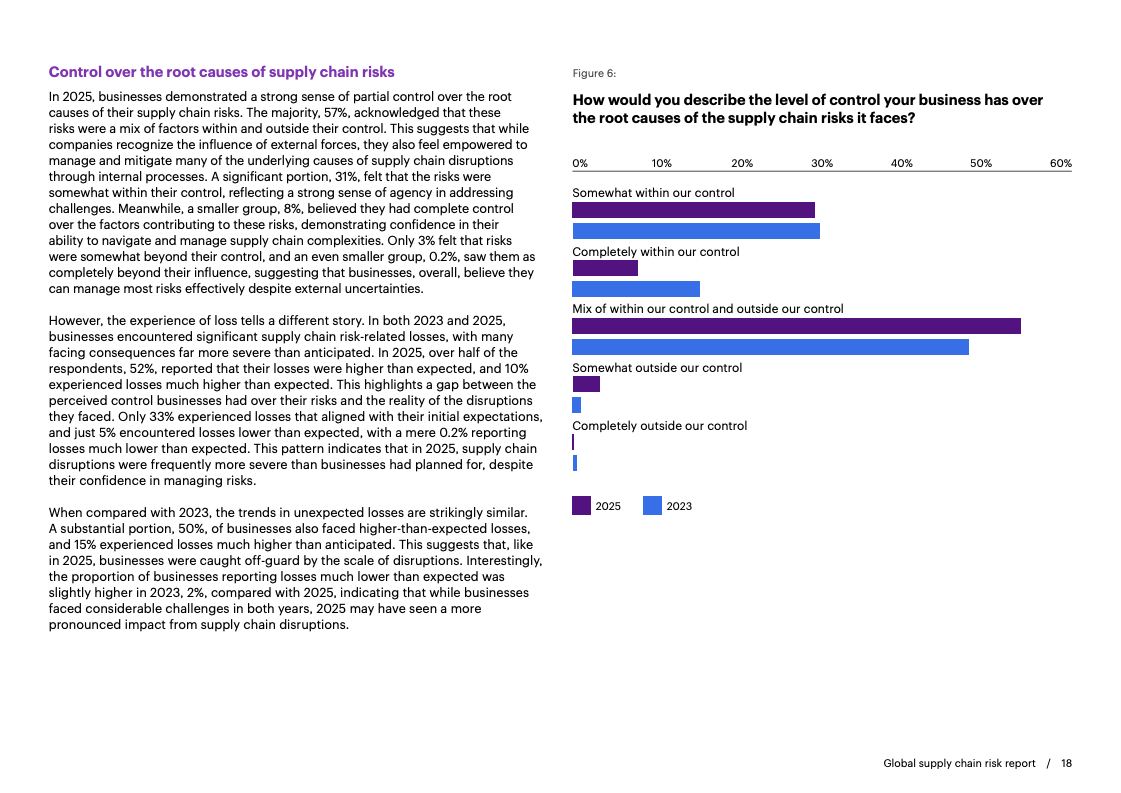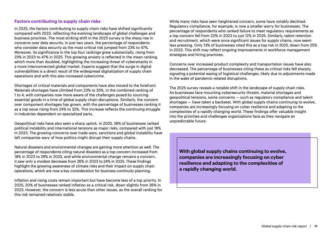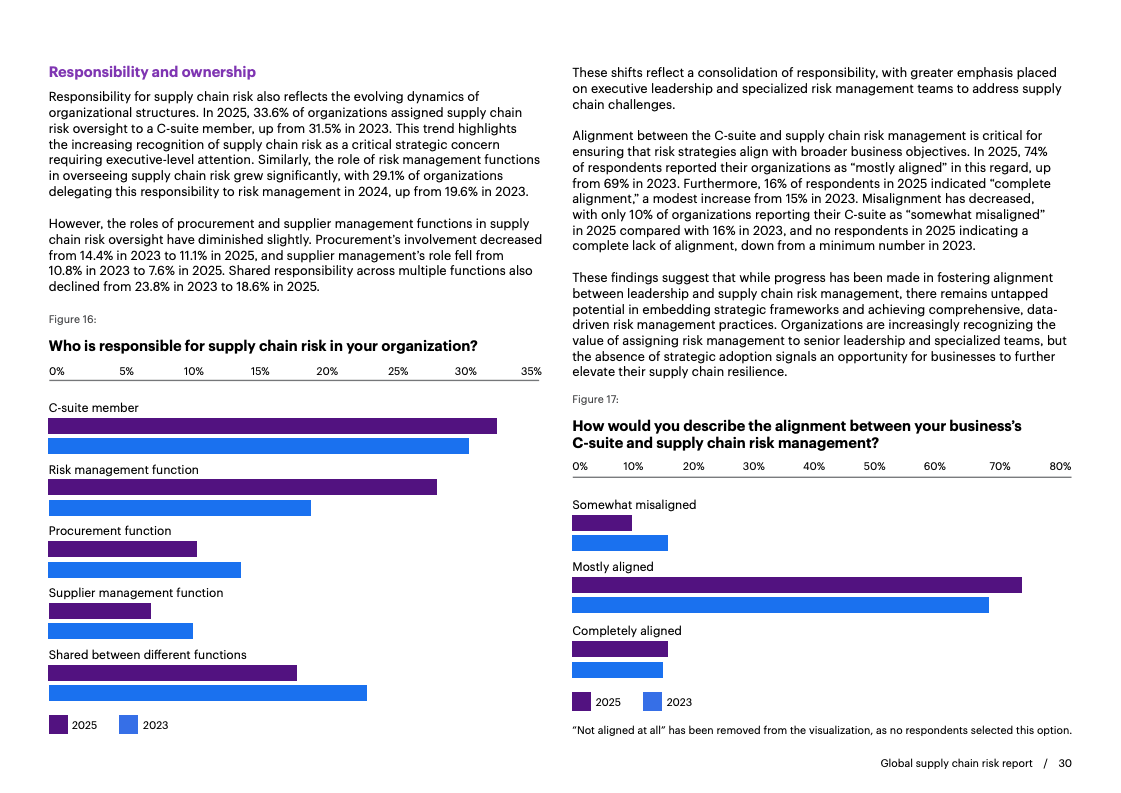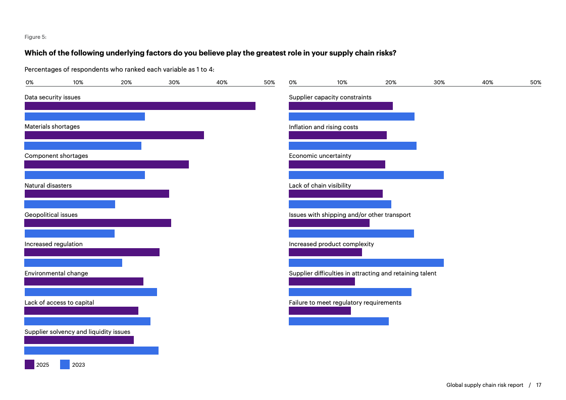 为应对这一系列变化,企业的风险管理策略正从成本驱动转向韧性优先。对离岸外包(Offshoring)的依赖度从26%降至15%,显示出全球化布局的回撤。取而代之的是对改善数据质量与共享(从43%增至58%)以及深化供应商关系(从54%增至60%)的战略倾斜,凸显了以数据驱动和协同合作为核心的供应链韧性建设思路。