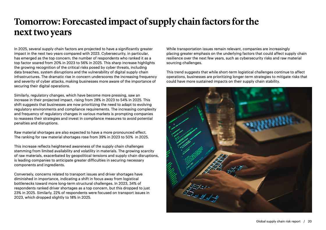 在具体的风险驱动因素层面,数据安全问题的重要性急剧上升,被视为关键风险的比例在两年内从23%翻倍至47%。原材料短缺的关注度从7%增至14%,而监管变动则从4%跃升至14%。这些底层因素共同构成了企业在未来两年内面临的核心挑战,其中,网络安全风险的预期影响更是从20%飙升至56%,成为企业最为警惕的潜在颠覆性力量。