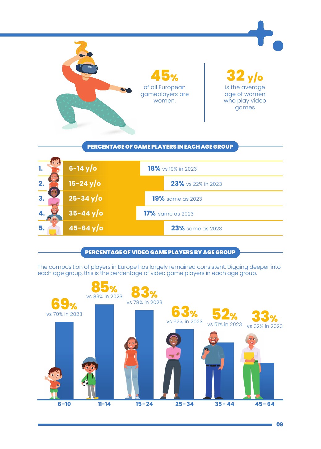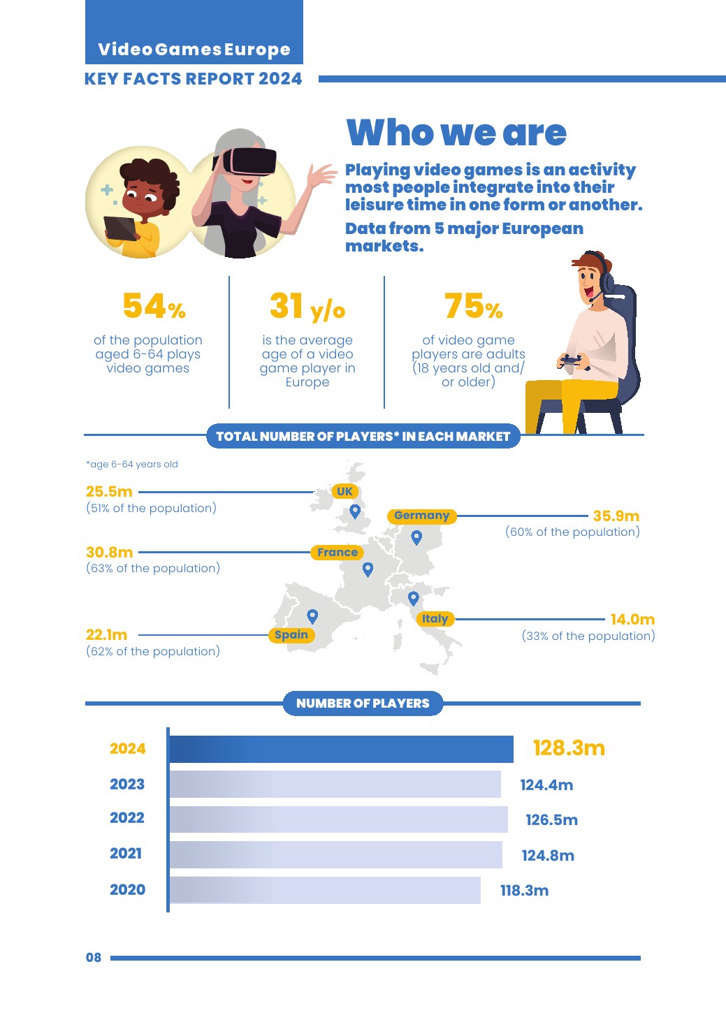 2024年欧洲游戏玩家总数从2023年124.4亿增至128.3亿,覆盖54%人口。