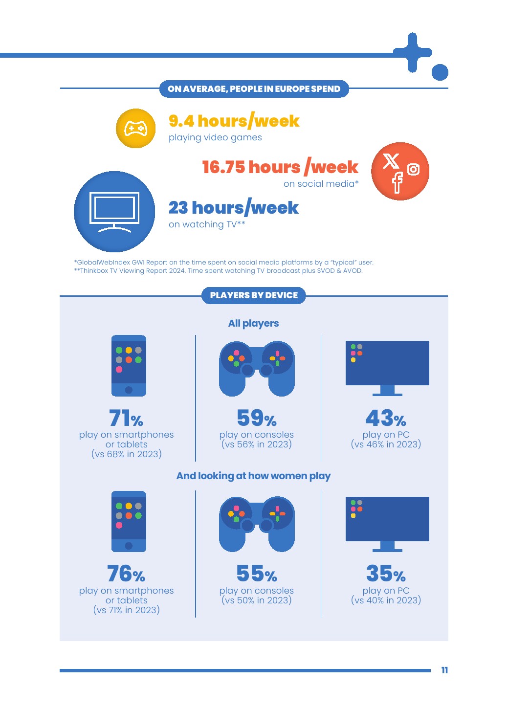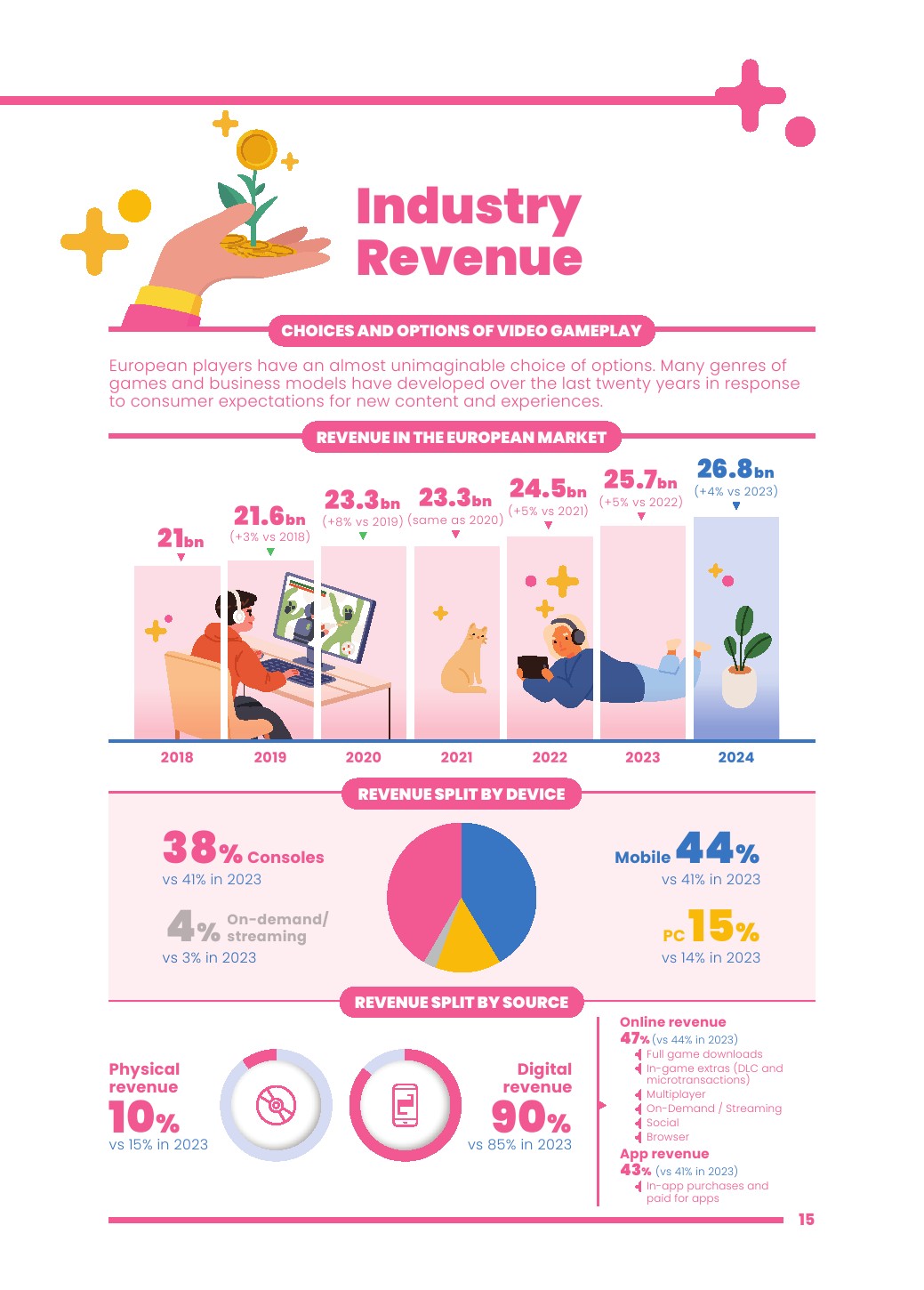 移动设备(智能手机/平板)为2024年主要游戏设备:贡献44%收入(同比增长3%),覆盖71%玩家(2023年为68%)。