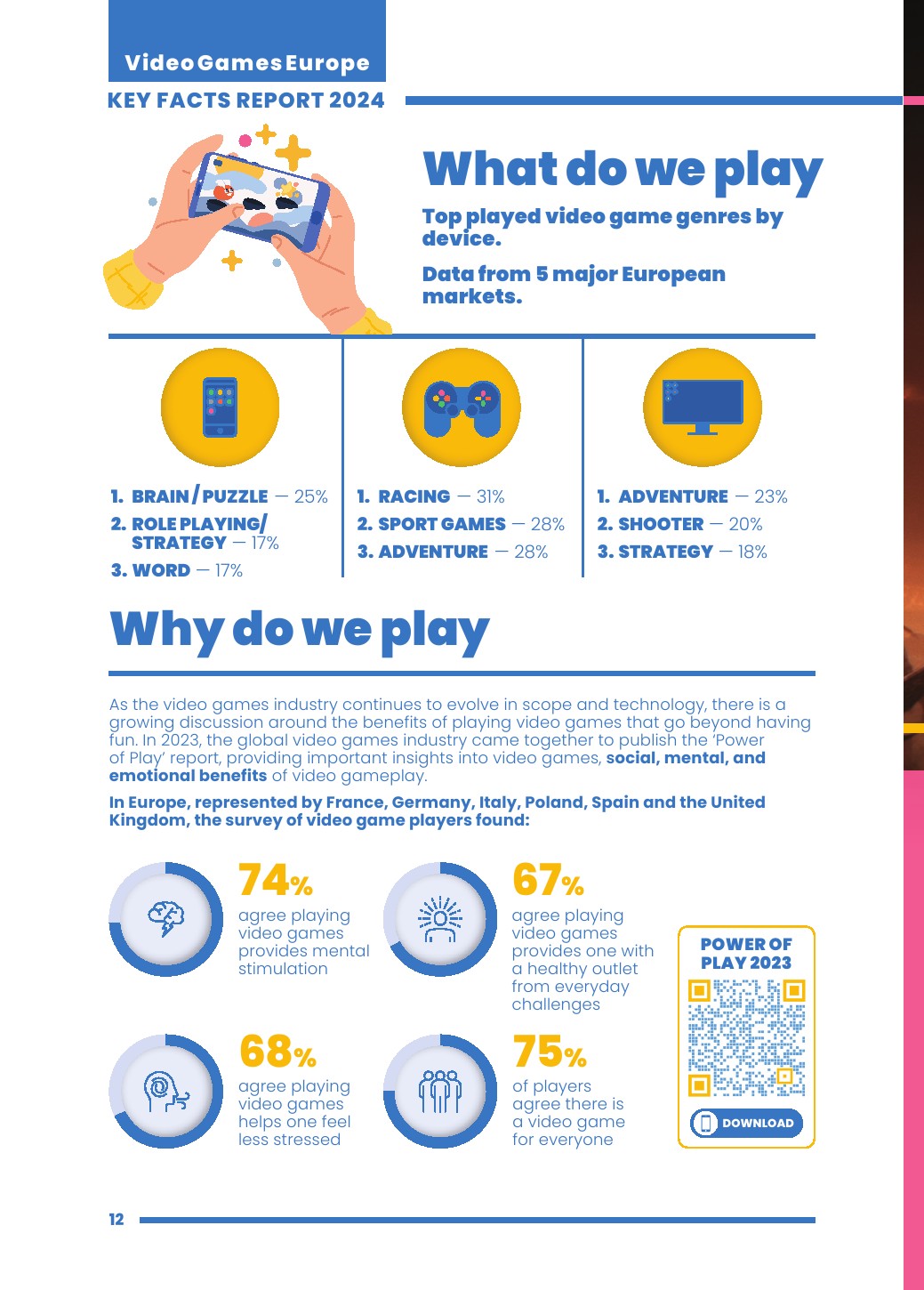 根据Video Games Europe与欧洲游戏开发者联合会(EGDF)发布的新报告“2025年欧洲视频游戏报告”,2024年欧洲主要游戏市场收入同比增长4%,数字购买占总收入的90%。