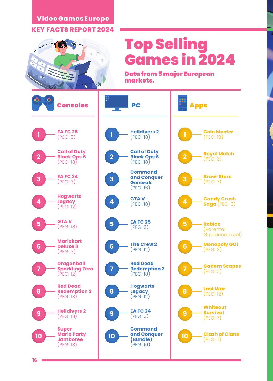报告显示五大市场游戏收入从2023年257亿欧元(299亿美元)增长至2024年268亿欧元(312亿美元)。
