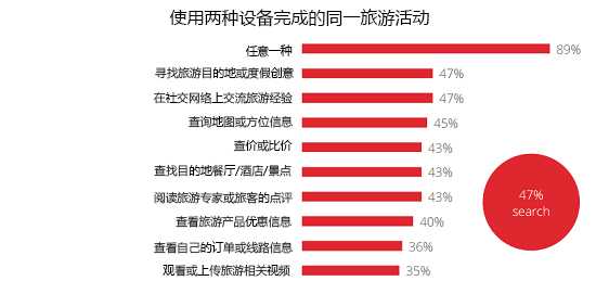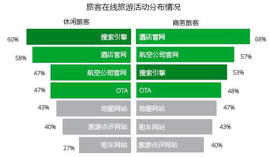 休闲旅客的在线旅游活动中,旅游相关搜索排名首位。而商务旅客中,旅游搜索排名第三。