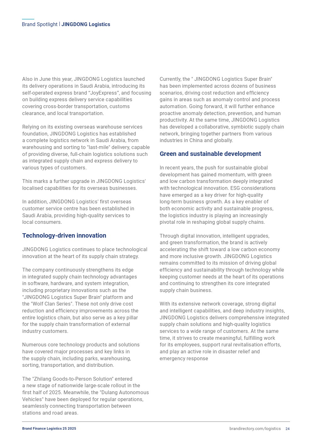 中国物流品牌在“强度”与“质量”维度上表现突出。顺丰品牌价值同比增长8%至64亿美元,京东物流以90.5分的品牌强度指数位居全球第一,并在ESG可持续发展感知中排名行业首位。京东物流2024年前三季度收入保持中高个位数增长,其在绿色物流、智能仓储及海外网络扩张方面的持续投入,显著提升了品牌溢价能力。