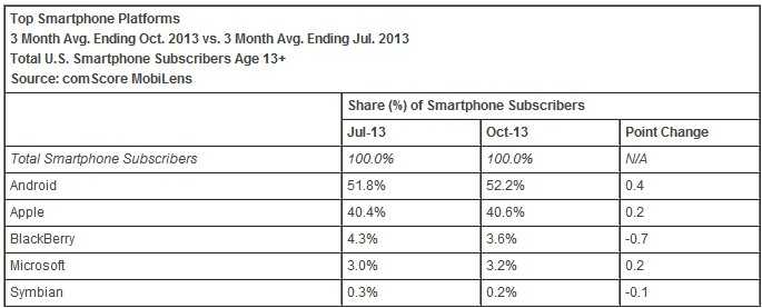 据美国互联网流量监测机构comScore 2013年10月智能手机行业趋势报告显示,苹果以40.6%OEM市场占有率成为第一大智能手机制造商,谷歌安卓以52.2%系统市场份额居智能手机操作系统首位。谷歌网站依旧是最热门移动网站,Facebook则为最热门应用。
