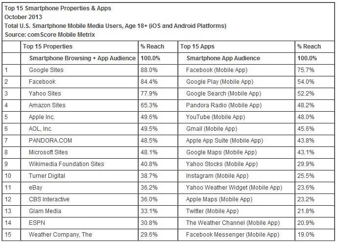 谷歌网站为最热门移动网站,移动用户覆盖率为88%,包括使用移动浏览器和应用的智能手机用户。其后依次为Facebook(84.4%),雅虎网站(77.9%)及亚马逊网站(65.3%)。Facebook为最热门移动应用,覆盖率为75.7%。 其次是Google Play(54%),Google Search(52.2%)及流媒体音乐服务Pandora(48.2%)。