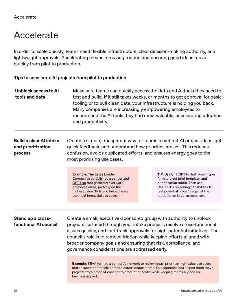 与此同时,加速机制决定了AI项目能否真正转化为生产力。雅诗兰黛通过集中化GPT实验室,在短期内收集1000多个点子并筛选出高价值项目,加速从概念到规模化的过程。而BBVA搭建跨部门AI委员会,实现快速审批与风险把控并行,有效解决不同团队间的摩擦,缩短了创新从原型到落地的周期。