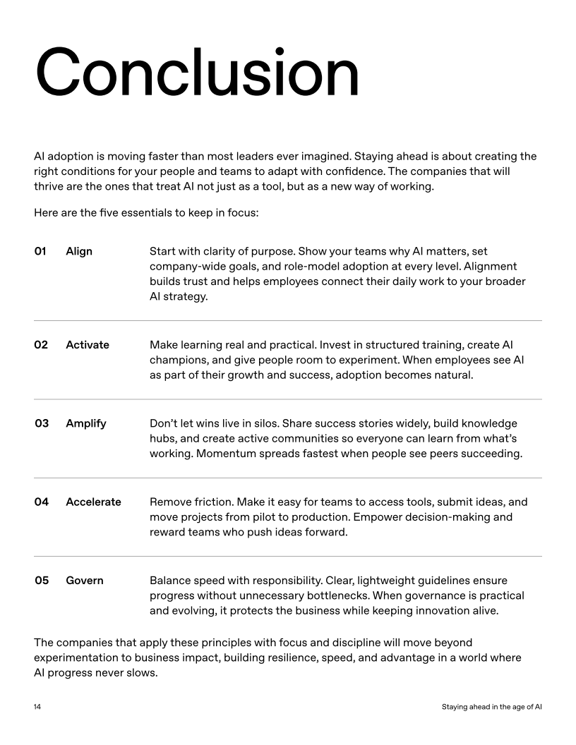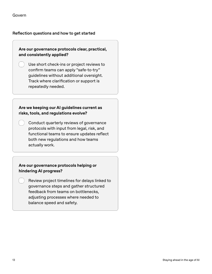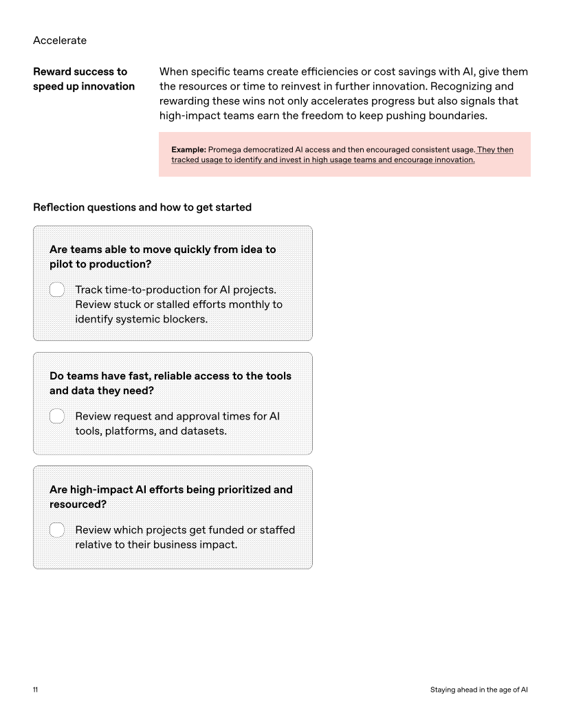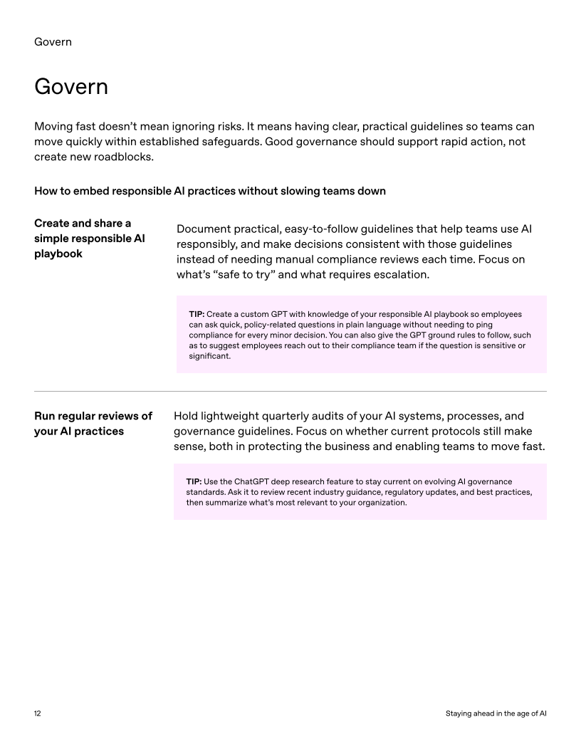 最后,治理框架是确保长期可持续发展的保障。治理不应成为创新的桎梏,而需建立简洁、分层的责任AI手册,并以季度审查的方式动态更新。通过规则明确“可尝试的范围”与“需上报的决策”,既避免了过度合规带来的拖延,也降低了风险。Promega等企业的实践表明,在民主化AI使用与奖励机制结合下,高频使用团队更容易获得资源,从而形成正向循环。