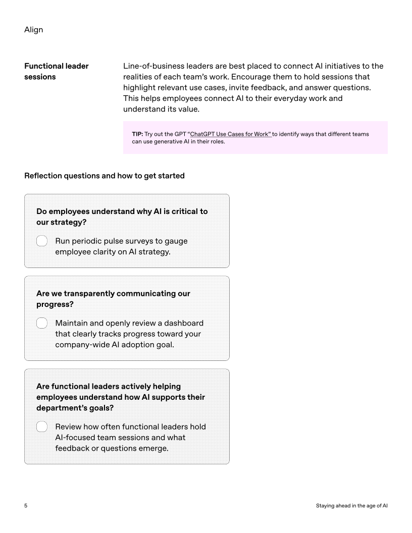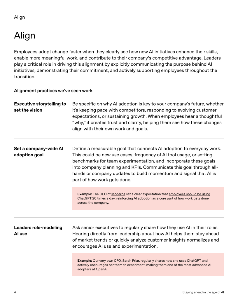 首先,企业的战略对齐是AI成败的前提。高层领导需要通过明确的叙事和目标来塑造AI愿景。例如,Moderna将员工使用ChatGPT设定为日常指标,要求每日不少于20次,以强化AI应用与组织目标之间的关联。透明的沟通机制、公司级AI采用目标和直观的KPI监控,能够显著提升员工对战略的信任与投入,从而降低技术转型的心理门槛。