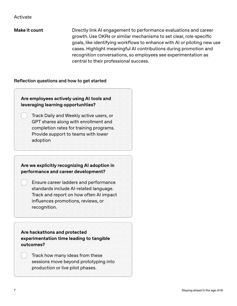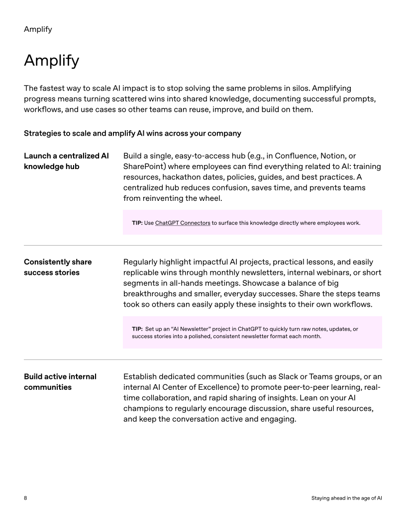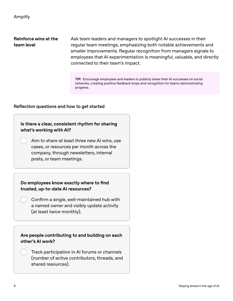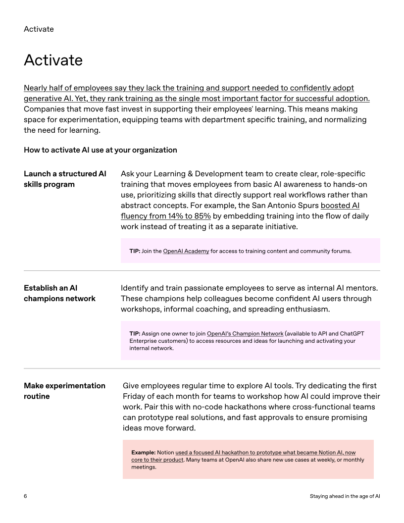 其次,员工培训与能力建设是落地的关键环节。近一半的员工表示缺乏必要支持,而实际案例显示,嵌入日常工作的培训比单纯的专项学习效果更显著。圣安东尼奥马刺通过分层培训将团队的AI熟练度从14%提升到85%。此外,内部AI“冠军网络”有助于扩大示范效应,而黑客松和跨部门实验不仅孕育了Notion AI等产品,也推动了创新文化的形成。