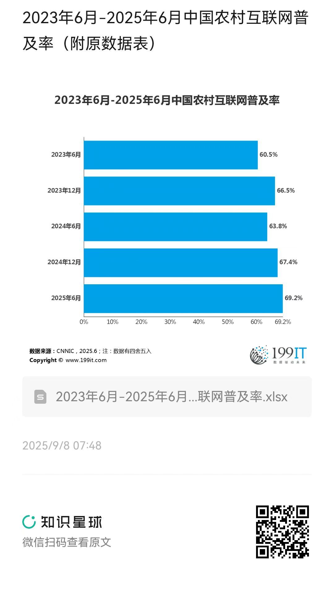2023年6月-2025年6月中国农村互联网普及率(附原数据表) ​​​