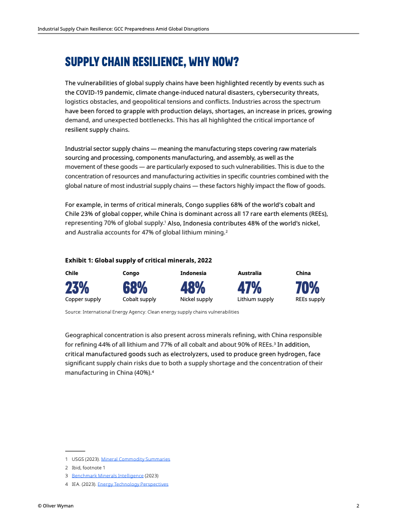近年来,全球供应链的脆弱性日益凸显,尤其受到新冠疫情、气候变化驱动的自然灾害、网络安全威胁、物流障碍及地缘政治紧张局势的影响。工业领域供应链因其原材料集中于特定国家及全球化特点,特别容易受到冲击。以关键矿产资源为例,全球钴68%产自刚果,铜23%来自智利,稀土元素近70%由中国供应。此外,关键制造业产品如电解槽等也高度依赖中国,约占40%产量。这种高度集中增加了供应链中断的风险,尤其对依赖进口的海湾合作委员会(GCC)国家影响尤深。