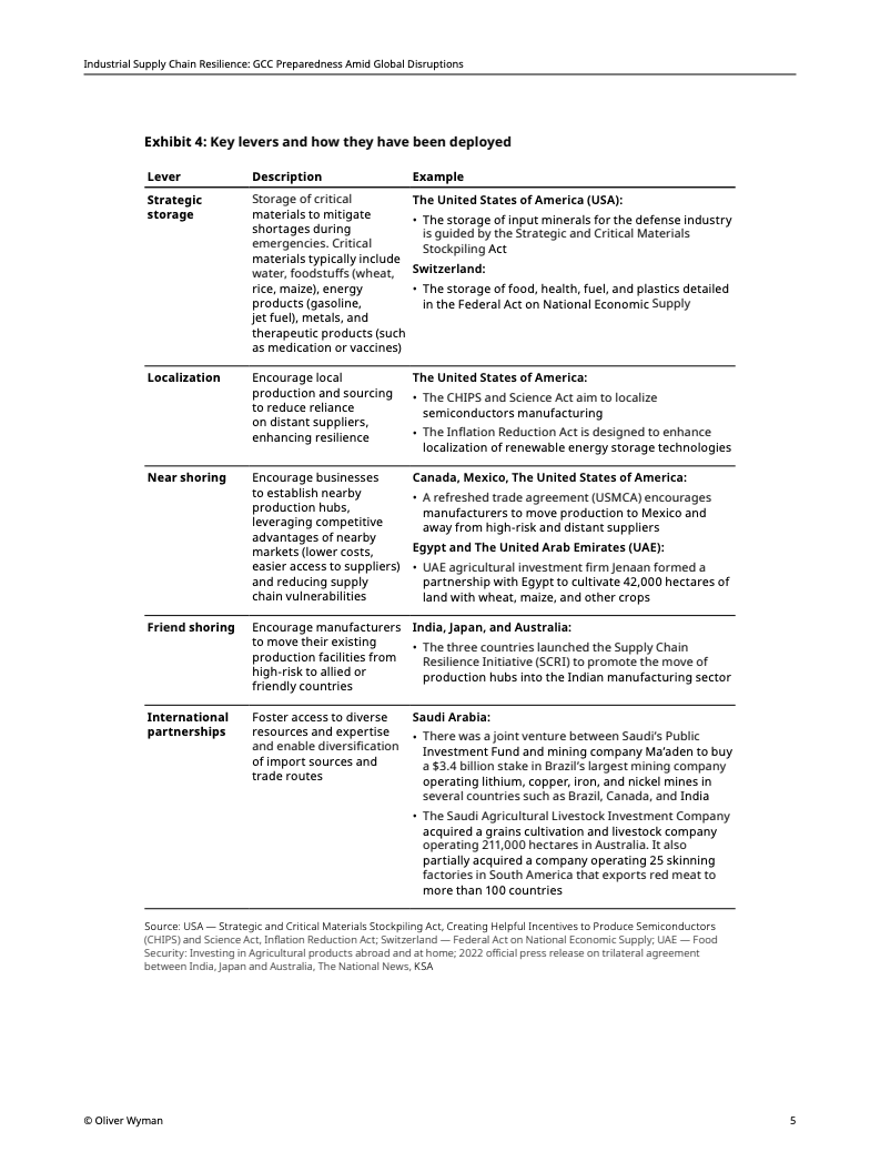 面对复杂的供应链风险,海湾国家采取了多种韧性杠杆措施,包括战略储备、地方化生产、近岸外包、友岸外包和国际合作。战略储备可缓冲紧急情况,如美国实施重要材料储备法案;地方化则通过促进本地生产升级,如美国芯片法案鼓励半导体本土制造。近岸和友岸外包策略帮助减轻过度集中风险。同时,国际合作案例丰富,例如沙特与多国矿业和农业企业的合作,增强资源获取和技术支持。