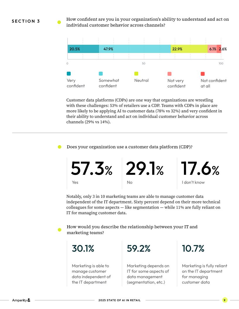数据基础成为分水岭。超六成企业(64%)认为其客户数据已结构化、可支持AI应用,但只有21%表示非常有信心理解并行动于客户行为。采用客户数据平台(CDP)的企业明显领先:他们每日或每周使用AI的比例为60%,是未使用CDP企业的两倍;在多个业务单元全面落地AI的比例也是后者的两倍以上(22%对10%)。更关键的是,62%的CDP用户已将AI应用到客户交互环节,而无CDP的企业仅为22%。