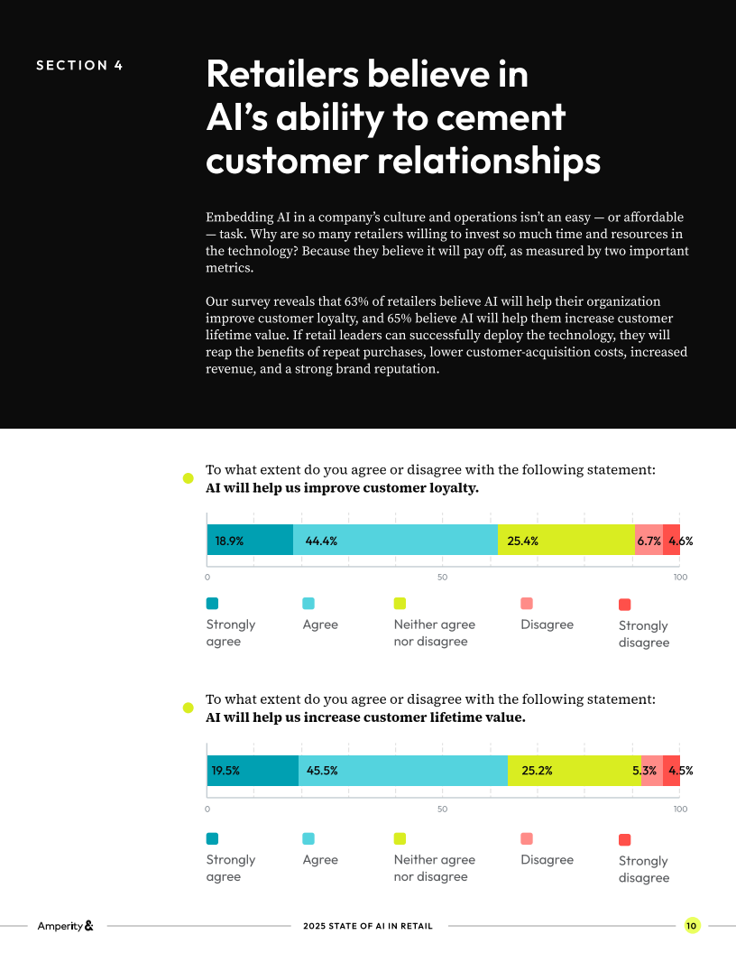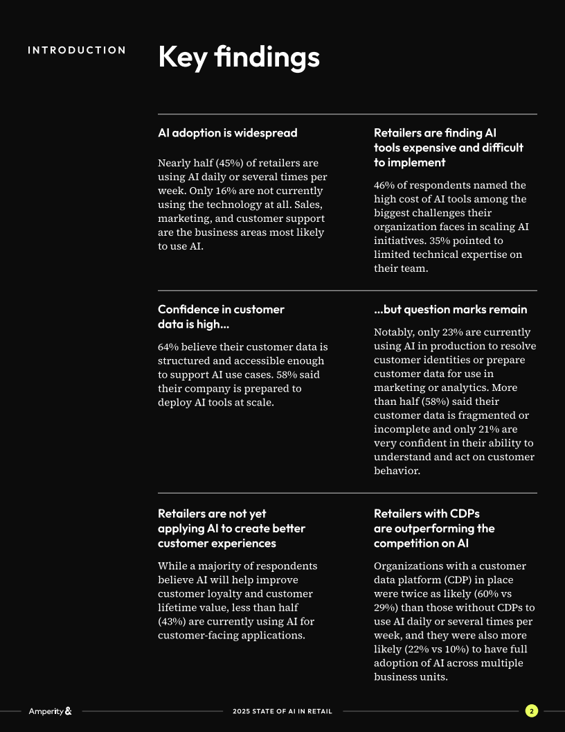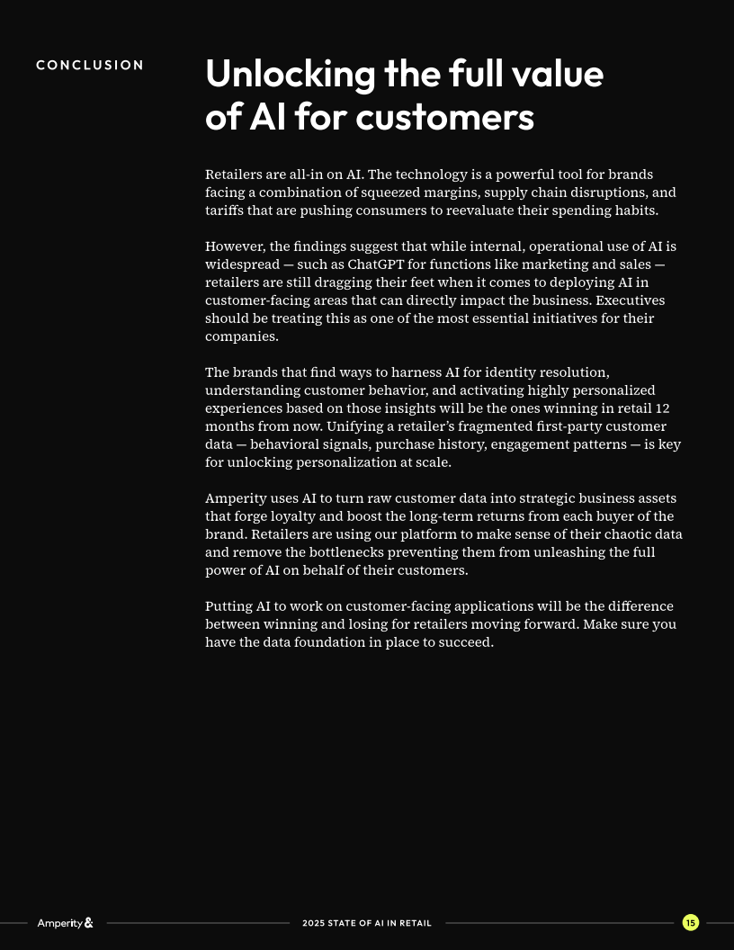 展望未来,零售业的AI竞争将从“规模应用”转向“深度整合”。仅仅在内部环节提效已不足以形成差异化优势,未来12个月的赢家,是那些能打通客户身份,整合全渠道数据,并在体验层面大规模落地个性化的企业。零售商若无法解决数据碎片和身份解析问题,AI就难以真正成为提升客户忠诚和长生命周期价值的引擎,而只会停留在后台自动化的辅助角色。在激烈的竞争环境下,谁先完成数据与AI的深度融合,谁将率先占领未来零售赛道。