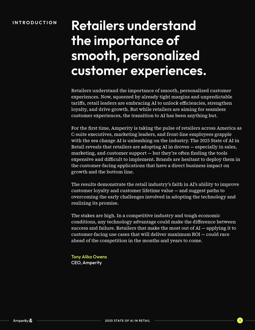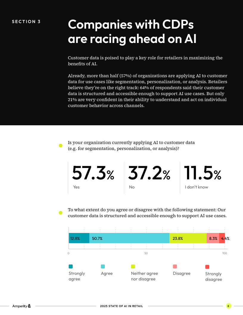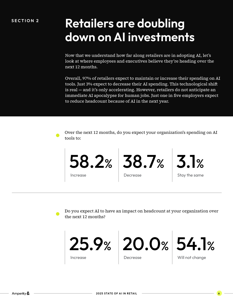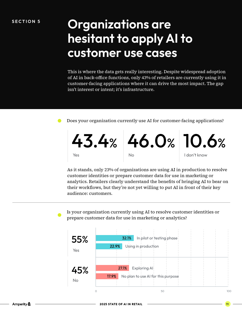 零售业正处于人工智能应用的十字路口:一方面,企业在销售、营销和客服等后端环节已大量使用AI;另一方面,涉及客户体验的前端场景中,AI仍未充分落地。Amperity对美国零售行业1000名从业者的调研结果揭示了这一转型过程中的真实困境与潜在机遇。