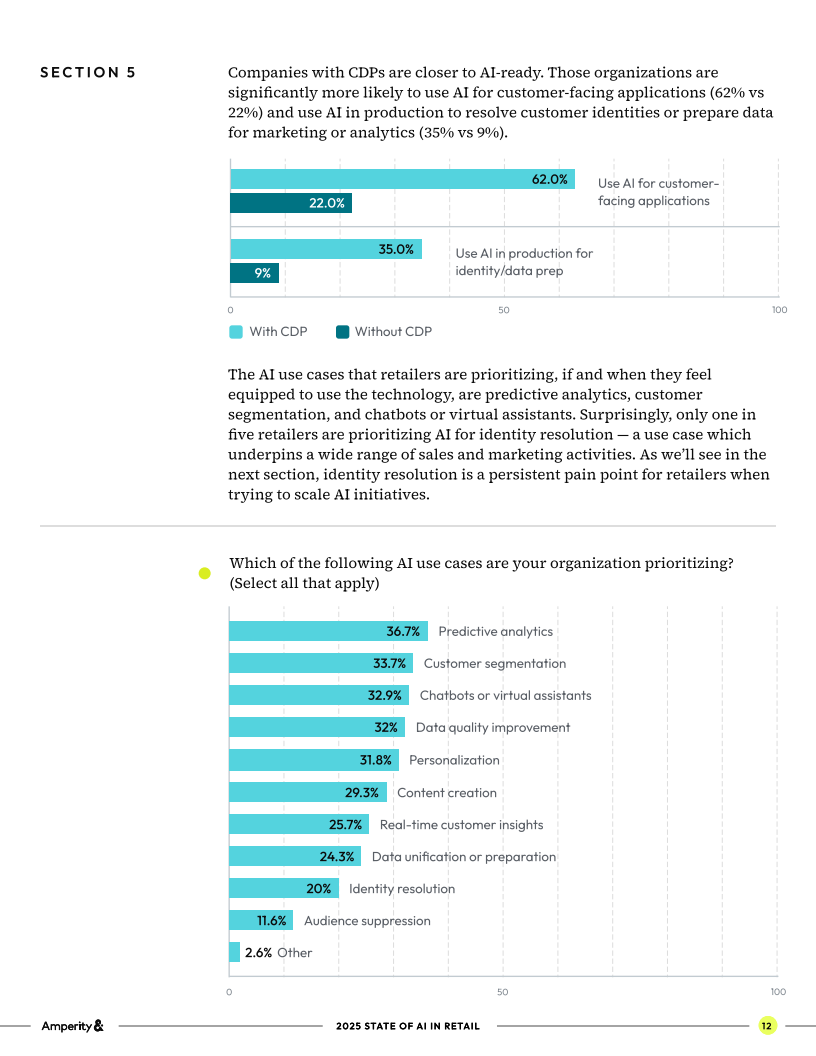 然而,客户触点上的AI仍显迟缓。虽然63%的企业认为AI有助于提升客户忠诚度,65%看好其提升客户终生价值,但目前真正使用AI进行客户交互的只有43%。更尖锐的短板体现在“身份识别”:只有23%的零售商在生产环境中利用AI进行客户身份解析或数据准备,而这恰恰是所有个性化营销和预测分析的前提。零售商更倾向优先投资预测分析(36.7%)、客户细分(33.7%)和智能客服(32.9%),而身份解析仅获优先级的20%。