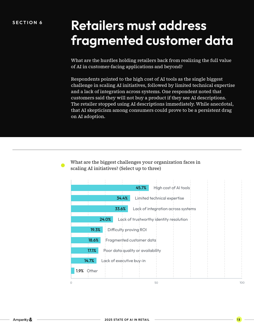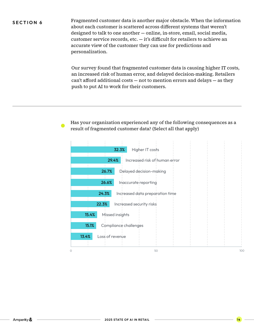 阻碍同样清晰可见。46%的受访者认为AI工具过于昂贵是最大挑战,35%则指向技术人才短缺,另有34%抱怨系统集成不足。数据碎片化问题更是长期困扰:分散在电商、门店、社交媒体、客服系统等孤岛中的数据增加了IT成本(32.3%的企业受影响),带来了人为错误风险(29.4%)与决策延误(26.7%)。这种结构性短板正在直接拖慢零售业AI的价值释放。