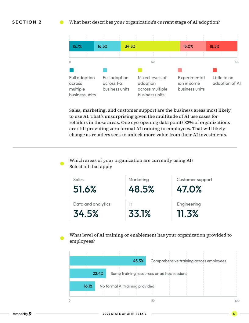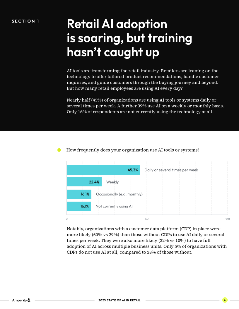 首先,从应用广度来看,近五成零售企业(45%)已实现AI日常使用,另有39%每周或每月应用,完全未使用的仅16%。最常见的应用集中在销售、营销和客服,占比分别为51.6%、48.5%和47%。但值得注意的是,AI培训远未跟上这一节奏,32%的企业尚未向员工提供任何正式培训,这意味着大量投资可能无法转化为实际生产力。