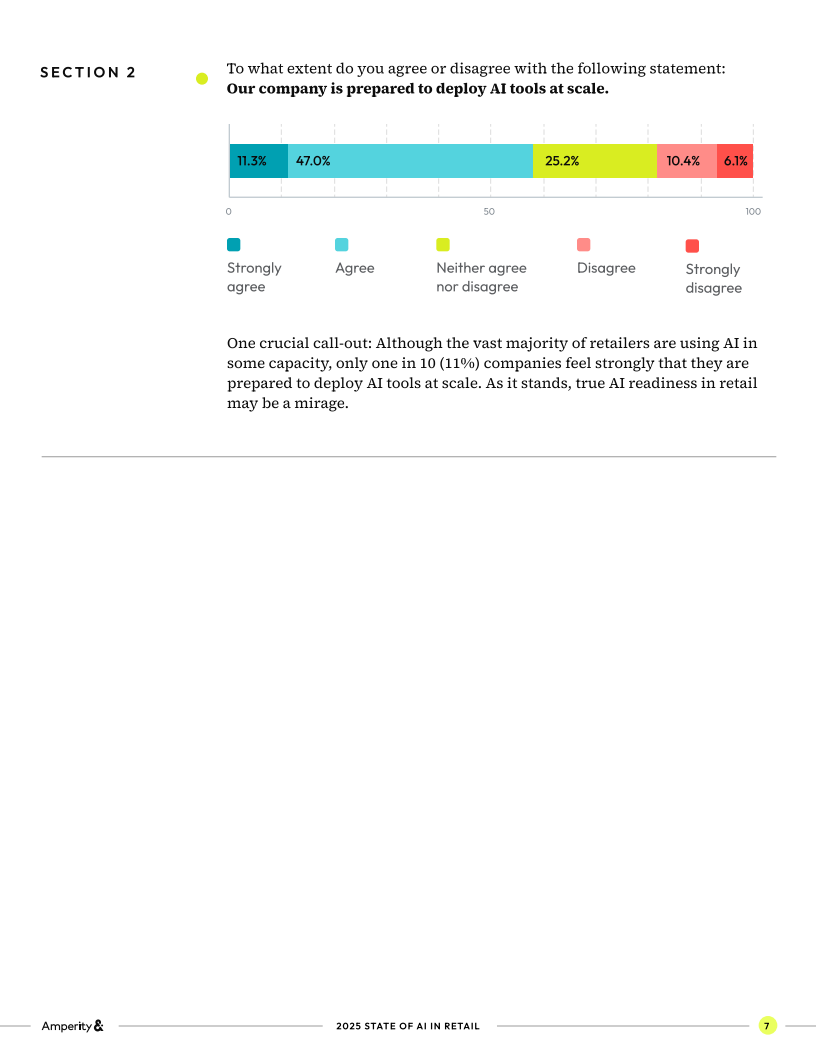 其次,资本投入持续加码。97%的受访企业计划在未来12个月维持或增加AI支出,仅3%考虑削减预算。但对于人力替代的担忧被显著淡化,仅20%的企业预期AI会带来裁员。这表明零售业将AI更多视为效率提升与客户经营的工具,而非简单的成本削减手段。不过,真正具备规模化部署信心的企业仅占11%,显示“AI准备度”与实际信心之间存在巨大落差。