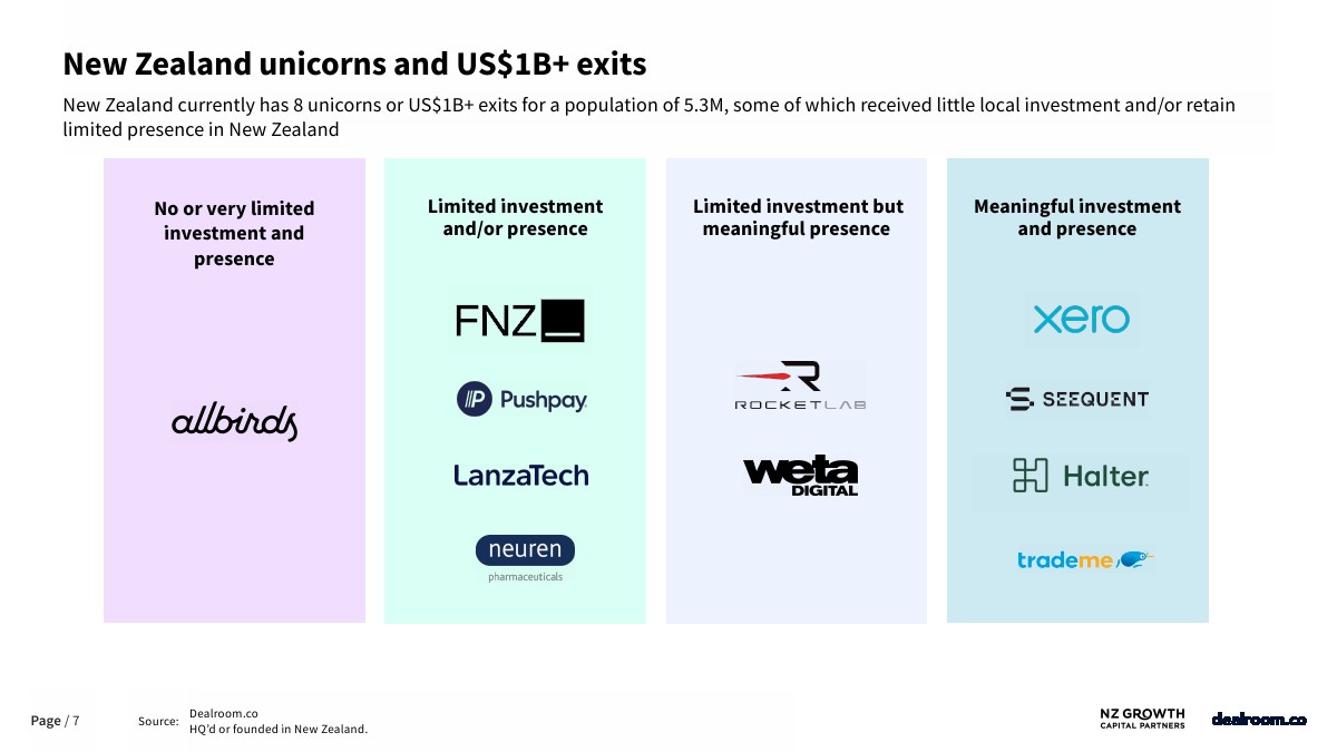 新西兰目前拥有8家独角兽企业或实现10亿美元以上退出的公司,对应人口530万。其中部分企业获得本地投资较少,和/或在新西兰保留有限存在。