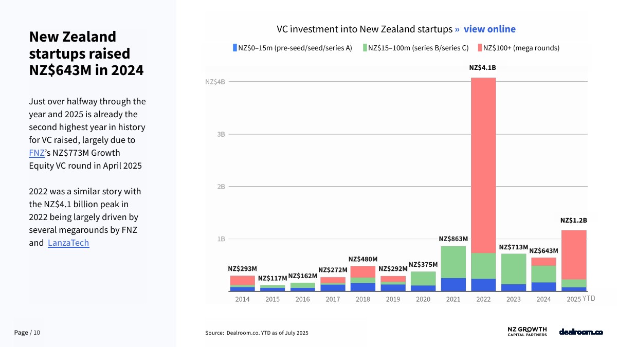 新西兰初创企业在2024年获得了6.43亿新西兰元投资。2025年刚过半,已成为风投募集历史上第二高的年份,这主要归功于FNZ在2025年4月完成的7.73亿新西兰元成长型股权风投轮。2022年情况类似,该年获得41亿新西兰元的投资峰值主要由FNZ和LanzaTech的几轮超大额投资推动。