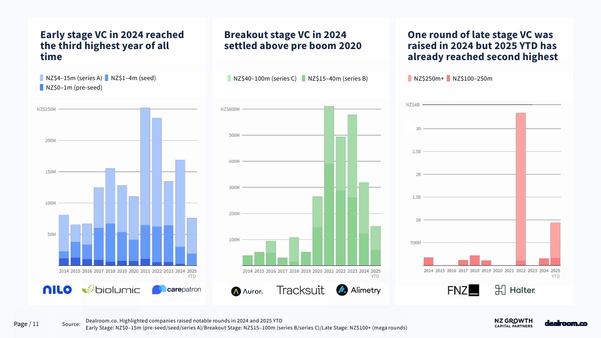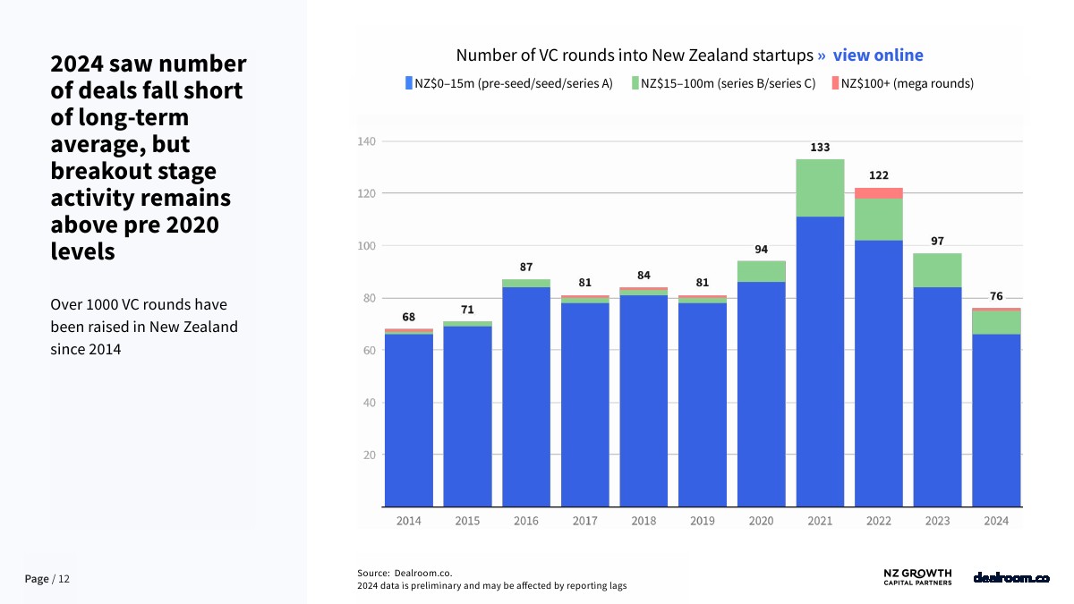 2024年的交易数量低于长期平均水平,但突破阶段活动仍高于2020年前水平。自2014年以来,新西兰已完成超过1000轮风险投资。