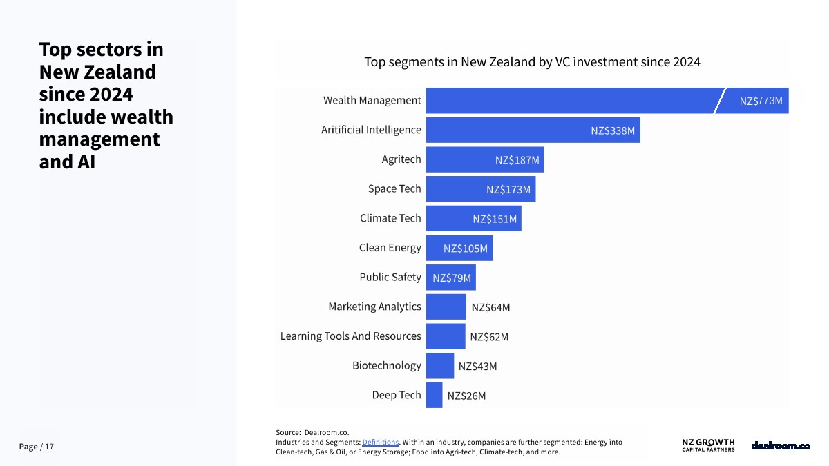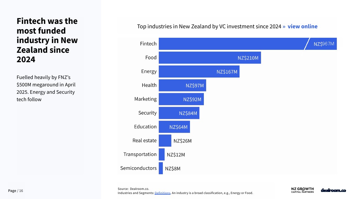 自2024年以来,金融科技是新西兰获得投资最多的行业。这主要受FNZ在2025年4月获得5亿美元超大额投资的推动。能源和安全科技紧随其后。