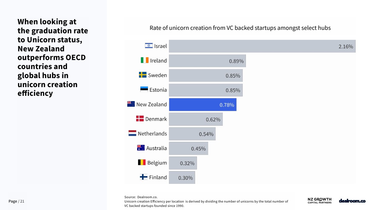 在考察晋升至独角兽状态的毕业率时,新西兰在独角兽创造效率方面优于OECD国家和全球枢纽