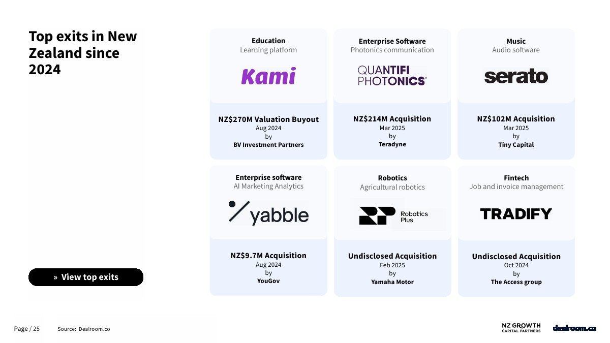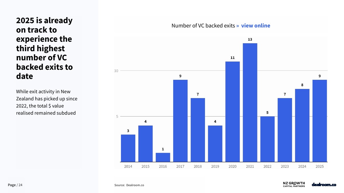 2025年已有望经历有史以来第三高数量的风投支持退出事件。尽管自2022年以来新西兰的退出活动有所增加,但实现的以美元计的总交易价值仍然低迷。
