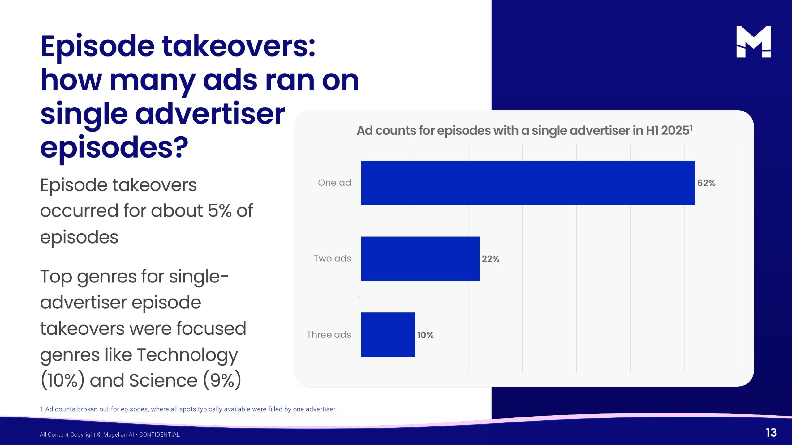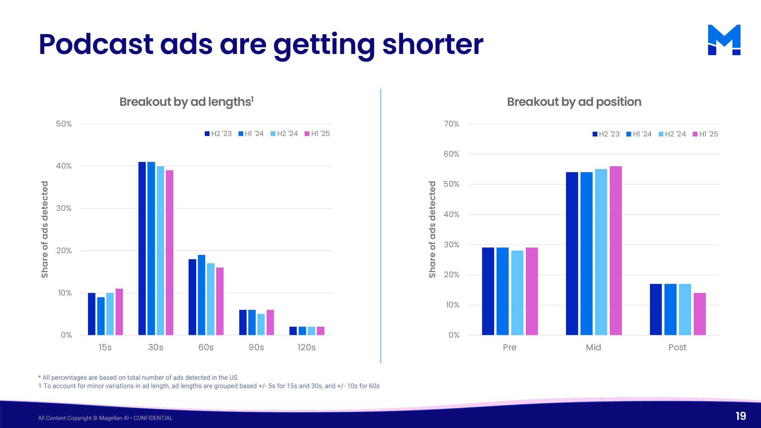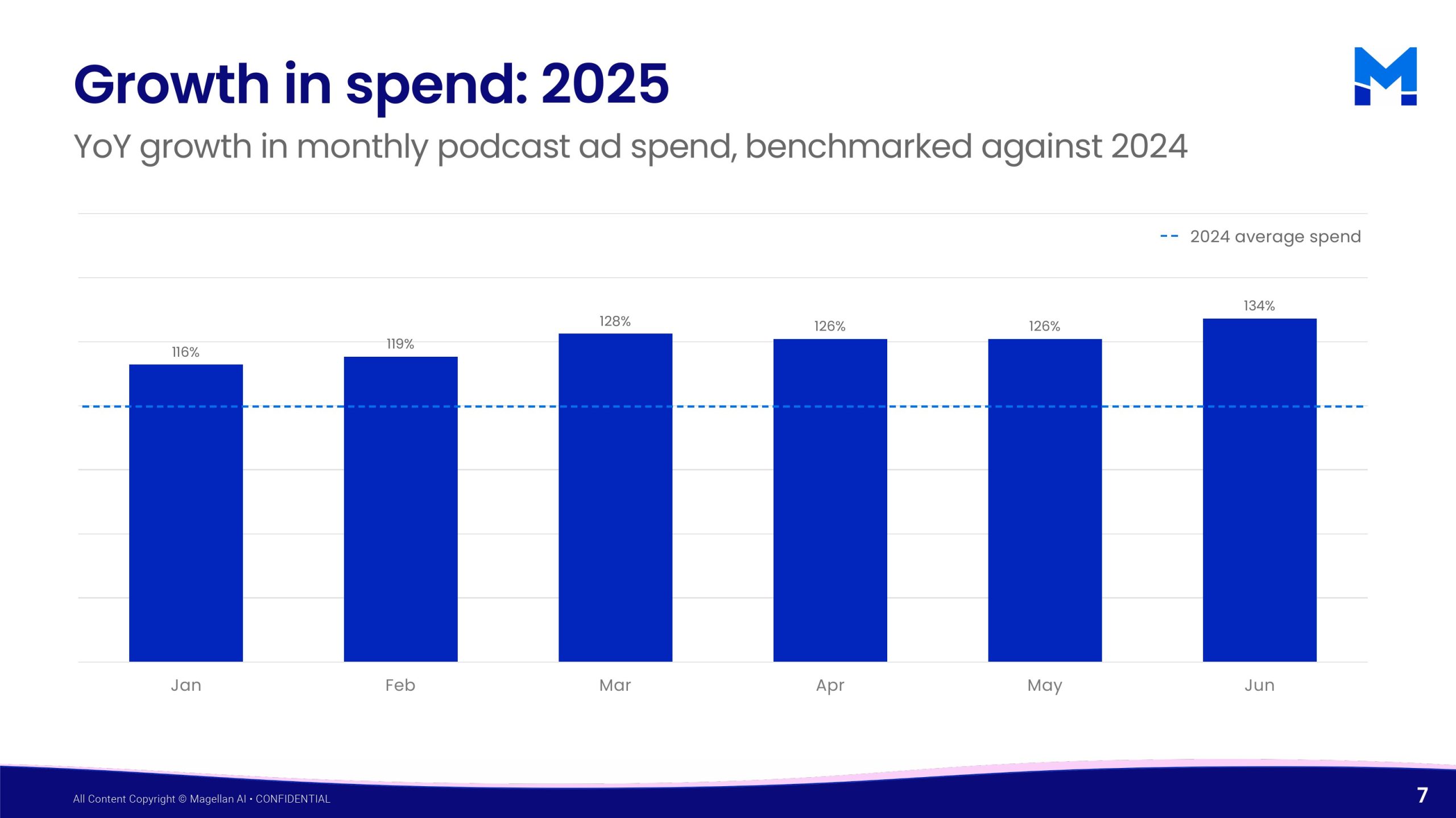 2025年上半年播客广告的顶级行业:金融服务;商业服务和软件;消费者服务和软件;应用程序;食品;赌博;营养补充剂;汽车;保险;电话、互联网、有线电视。