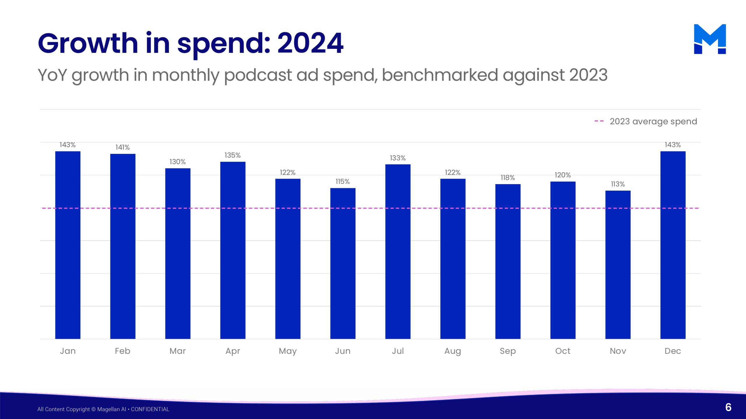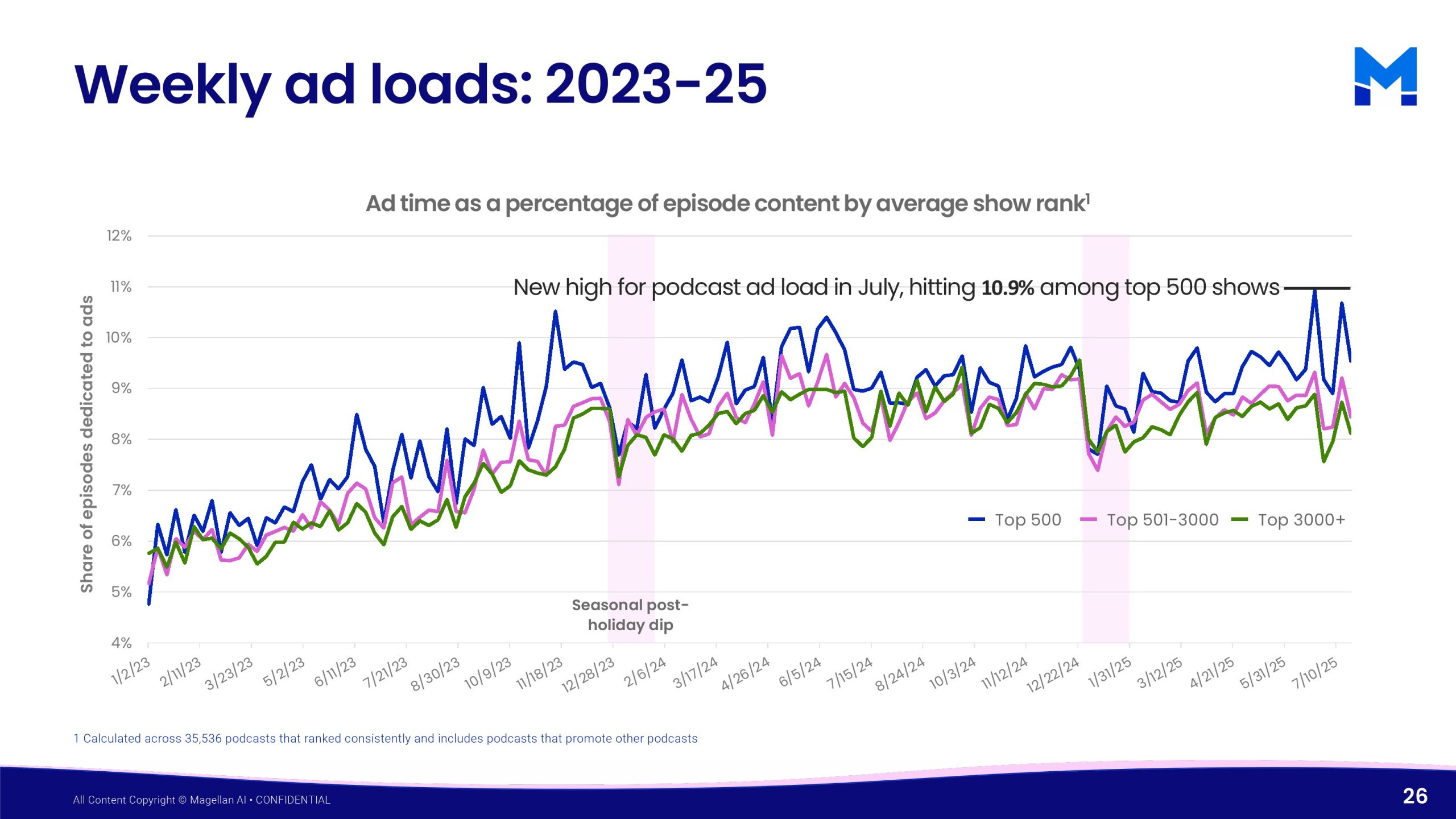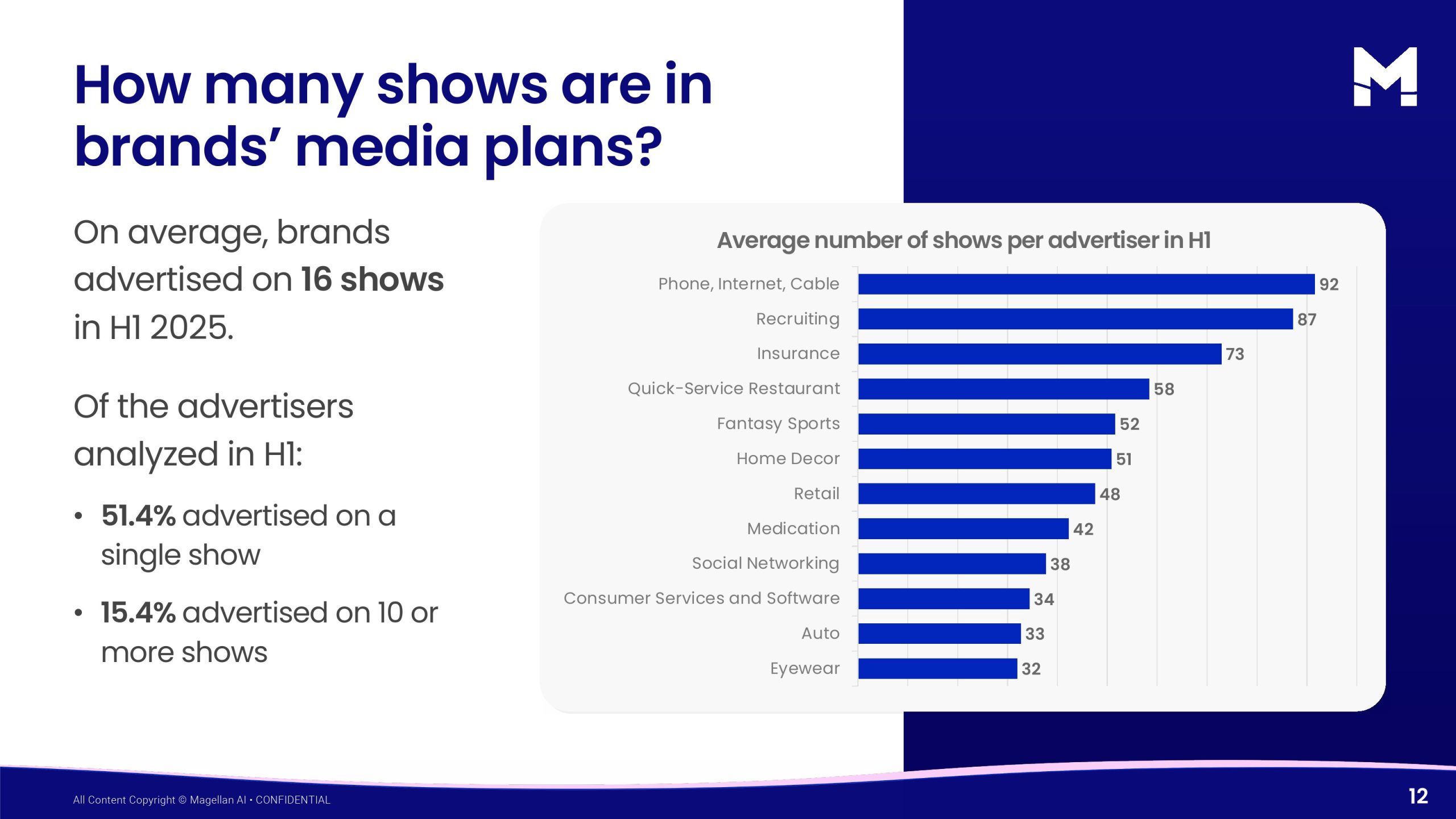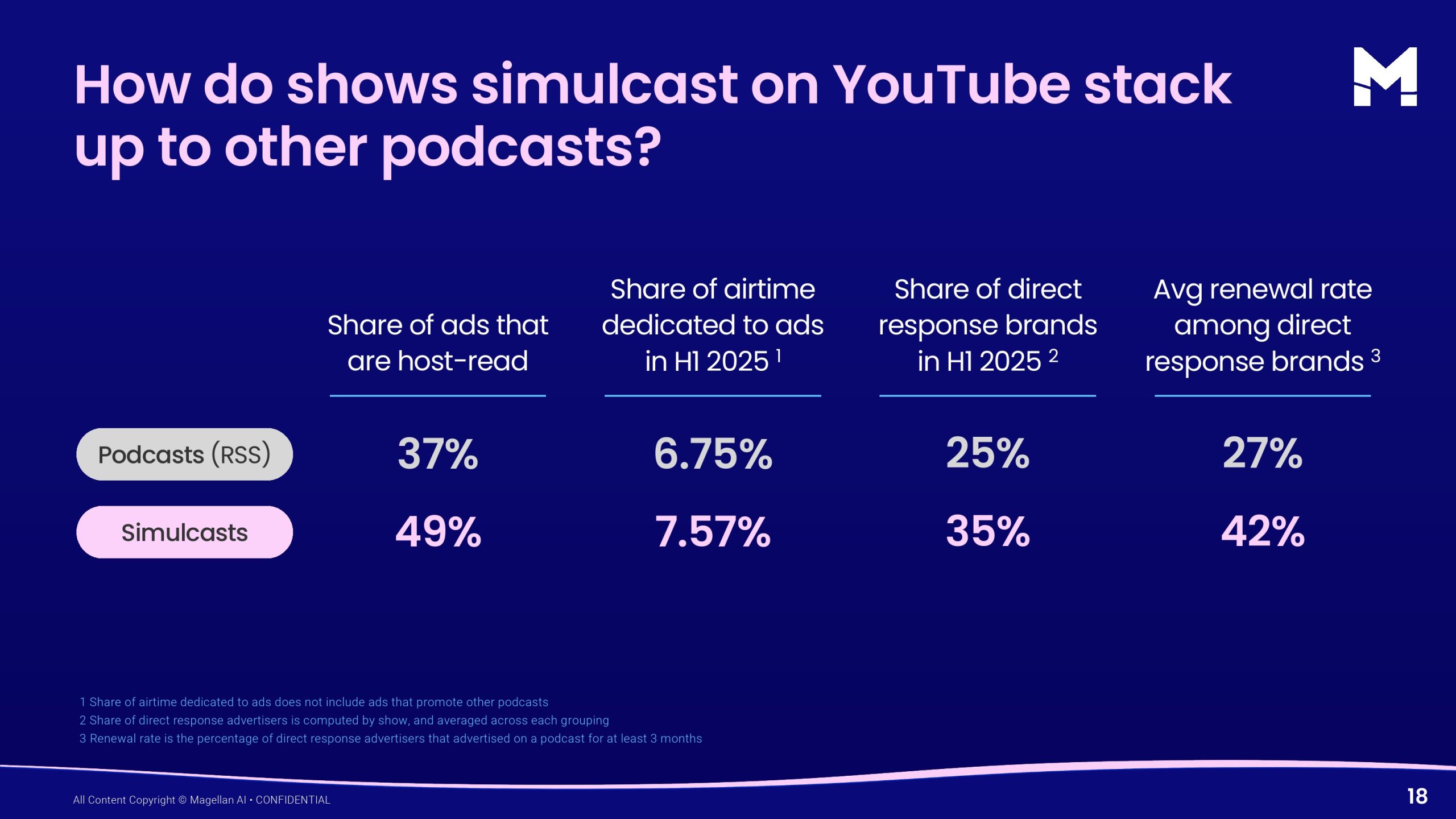 2025年上半年播客广告的顶级行业:金融服务;商业服务和软件;消费者服务和软件;应用程序;食品;赌博;营养补充剂;汽车;保险;电话、互联网、有线电视。