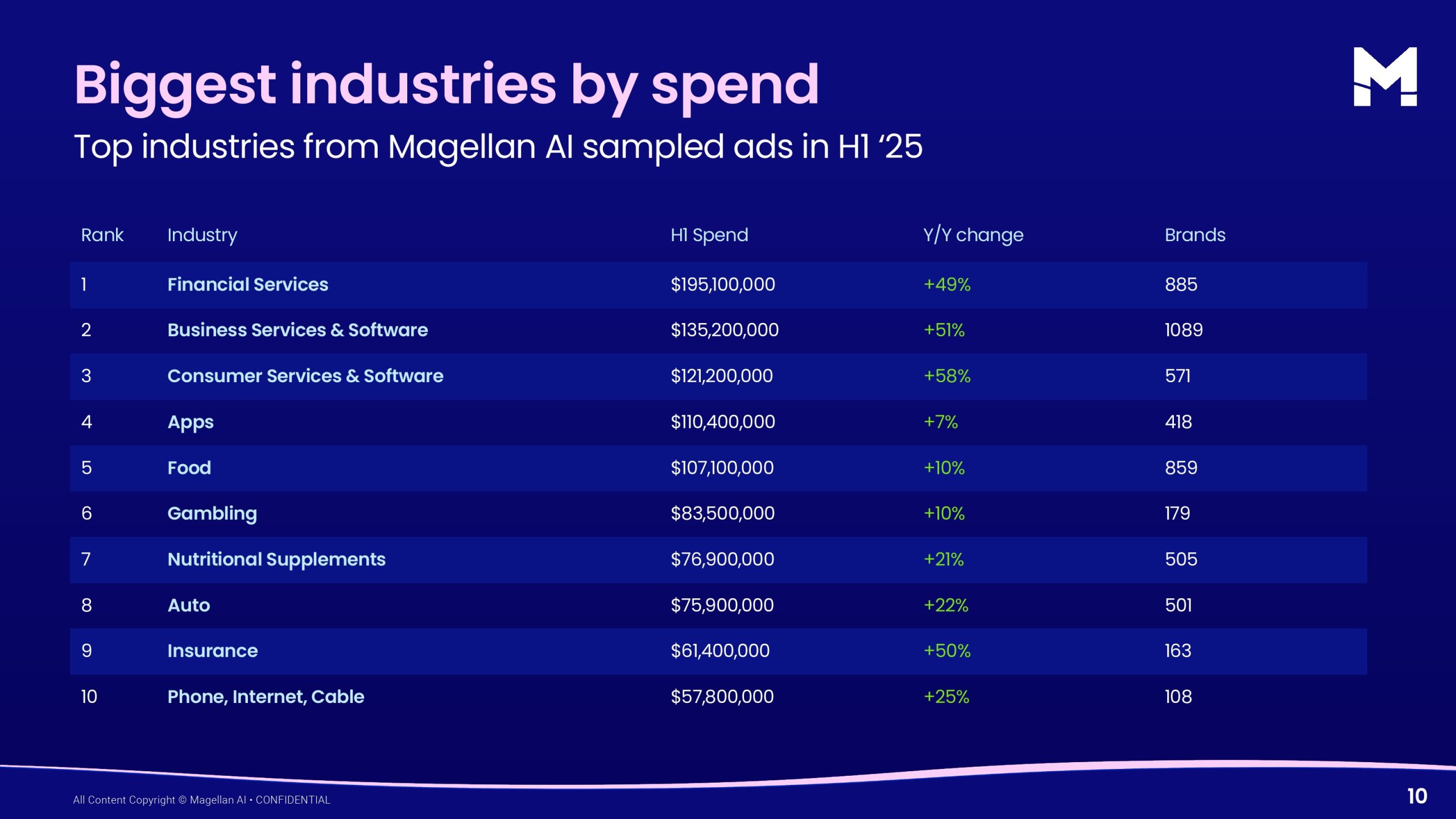 2025年上半年排名前10的广告主估计支出2.31亿美元,环比增长1.9%(与2024年下半年相比)。