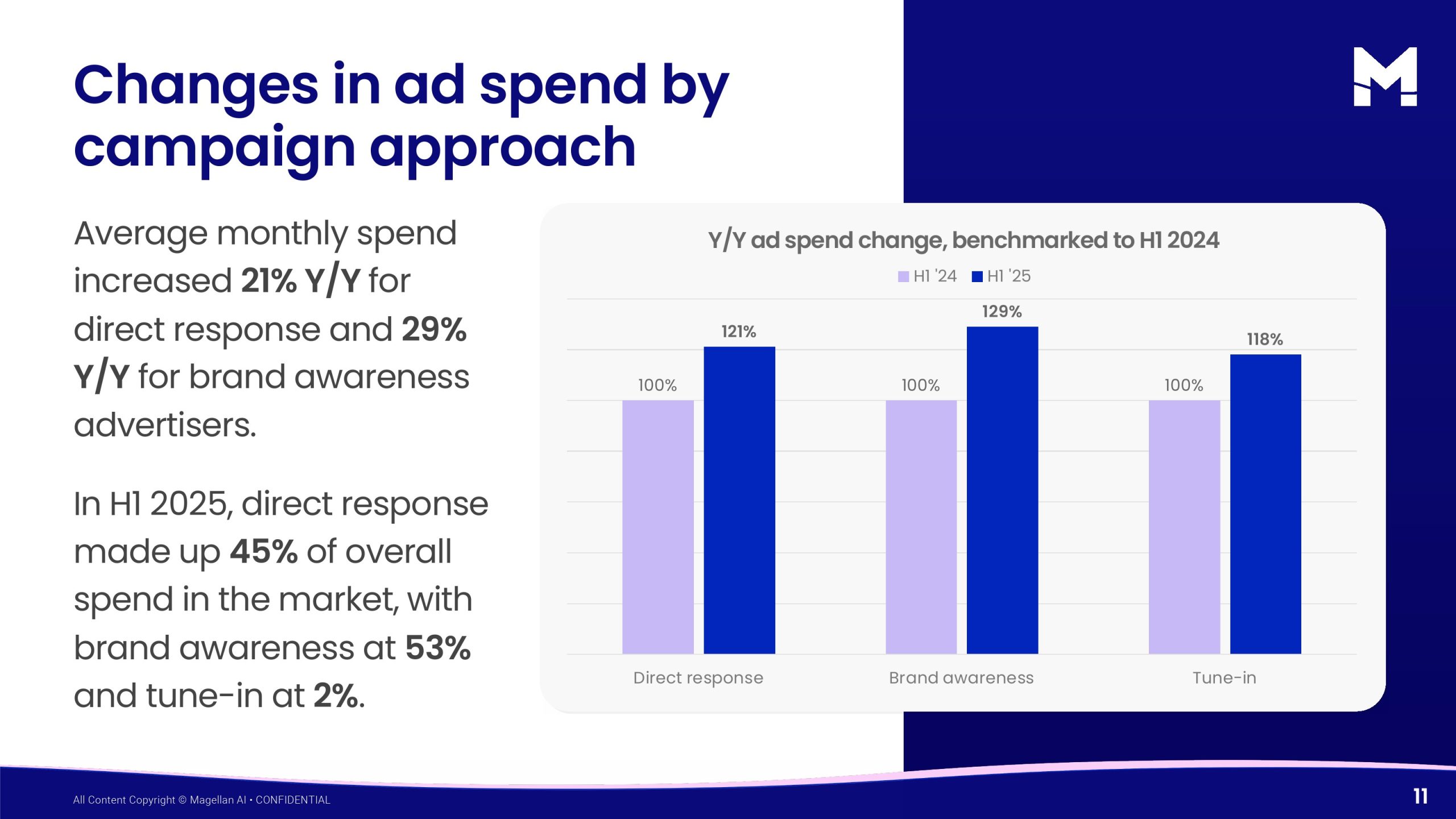 2025年上半年,直接响应占市场总支出的45%,品牌知名度占53%,调频广告占2%。
