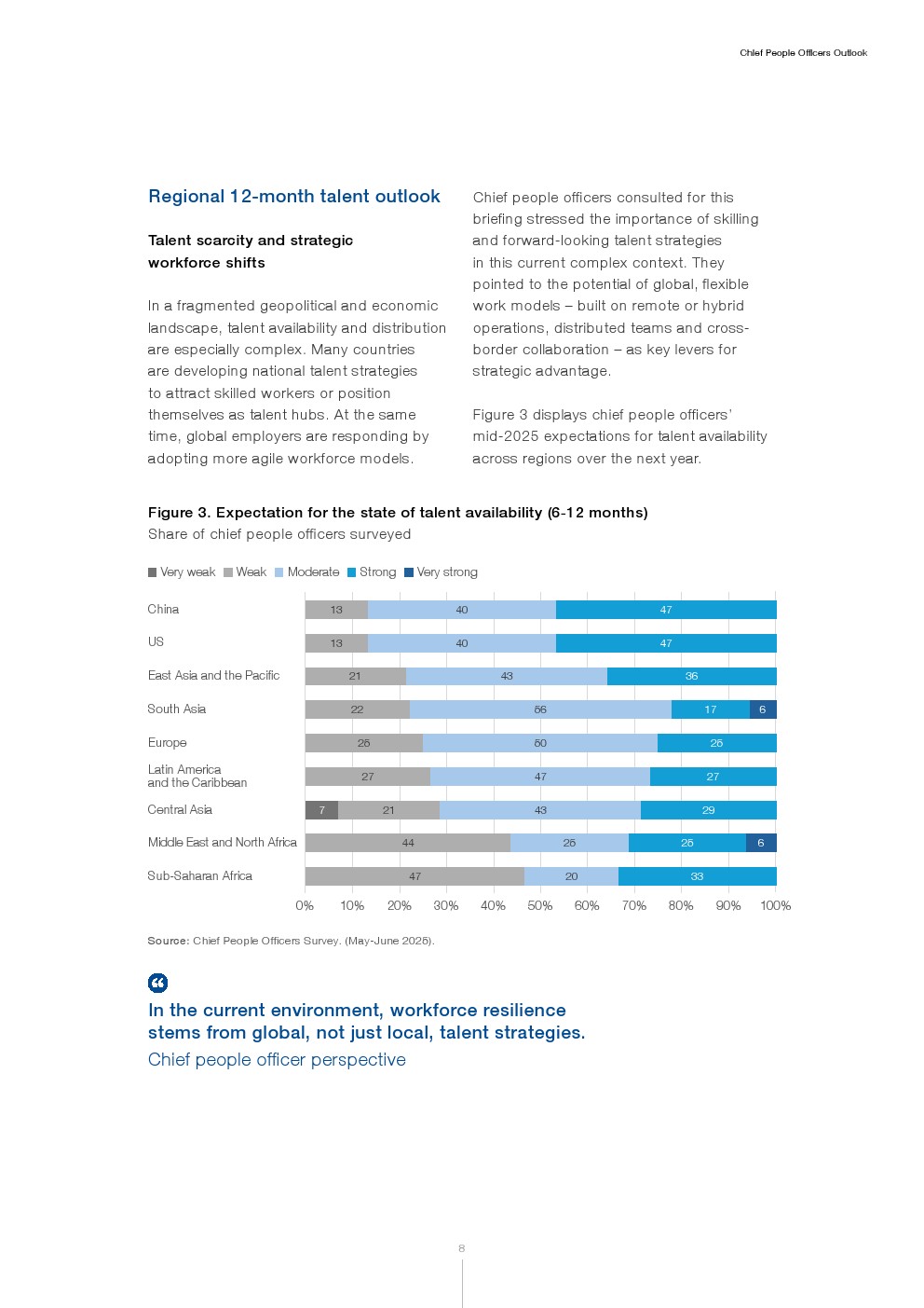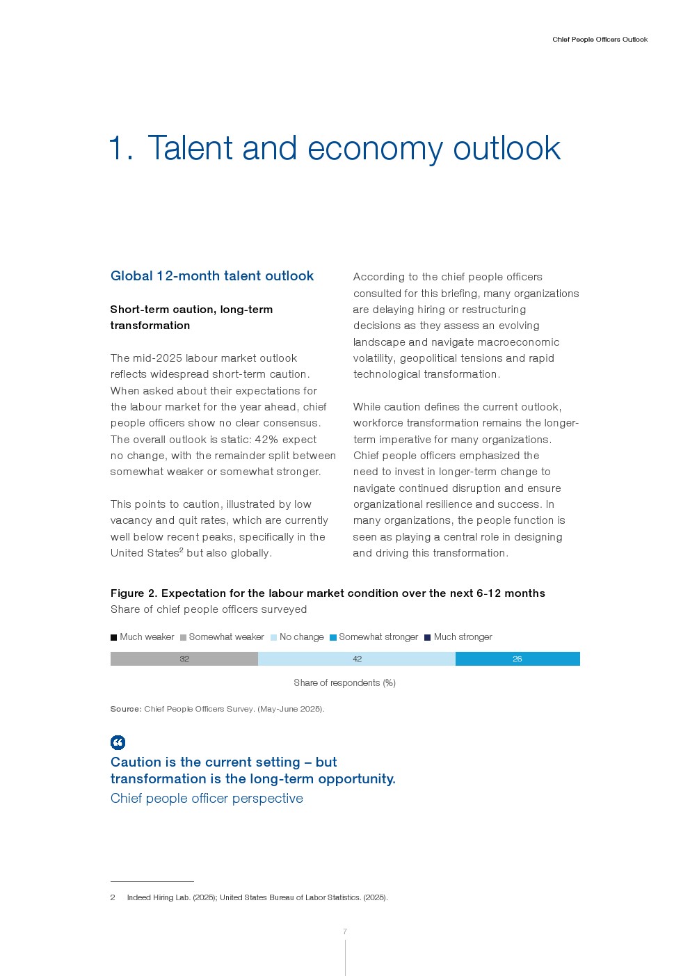 2025年年中的劳动力市场展望反映出普遍的短期谨慎情绪。当被问及对未来一年劳动力市场的预期时,首席人力官未表现出明确共识。整体展望呈停滞状态:42%预计无变化,其余则分为略微疲软或略微强劲。