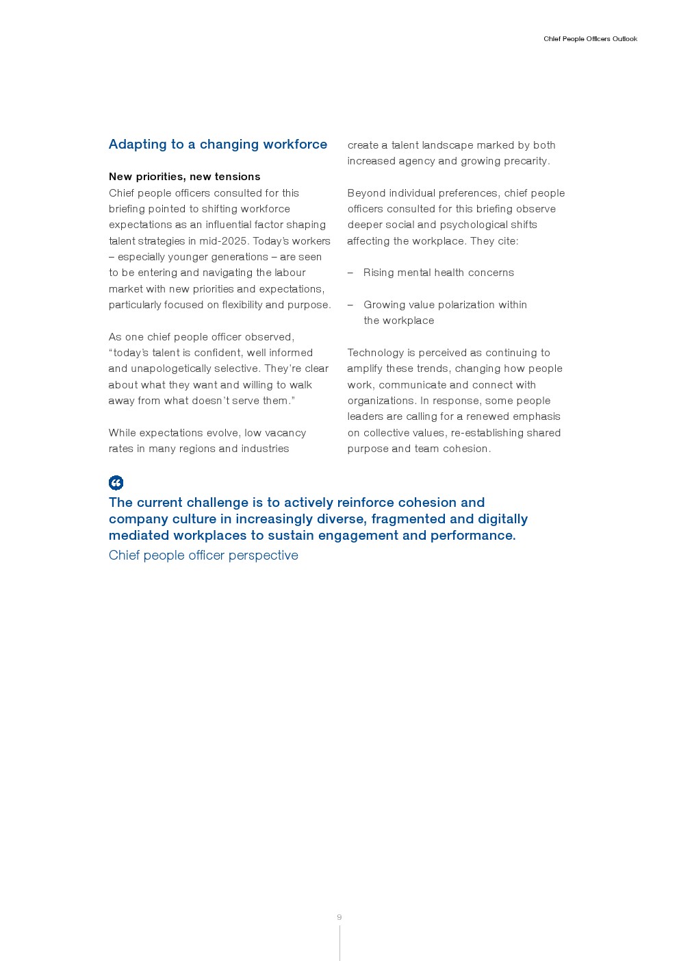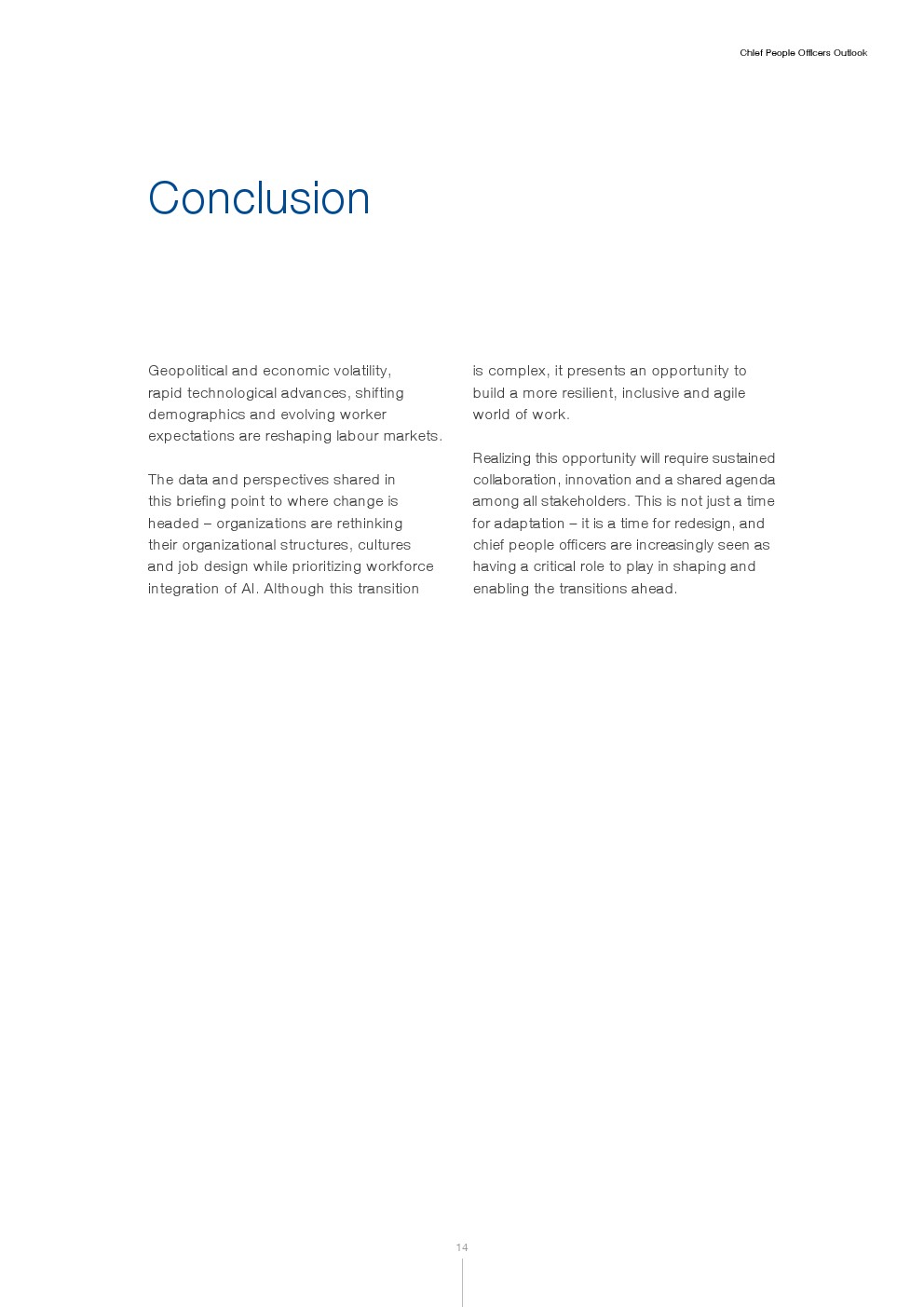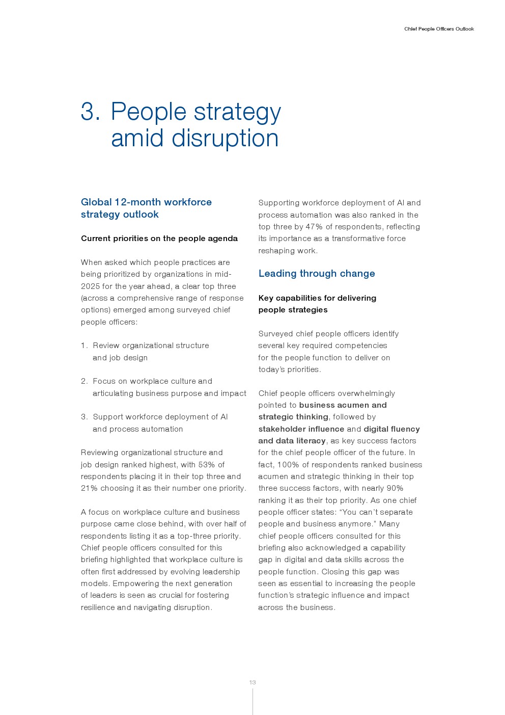 尽管谨慎是当前展望的主基调,但劳动力转型仍是许多组织的长期要务。首席人力官强调,有必要投资于长期变革,以应对持续颠覆并确保组织韧性与成功。在许多组织中,人力资源职能被视为在设计和推动这一转型中扮演核心角色。