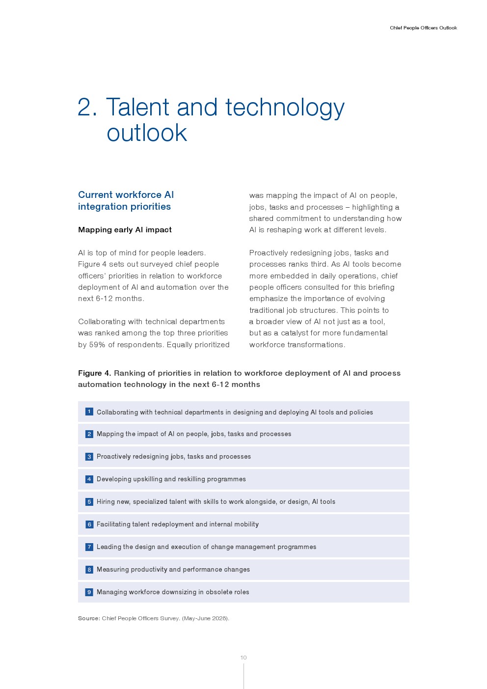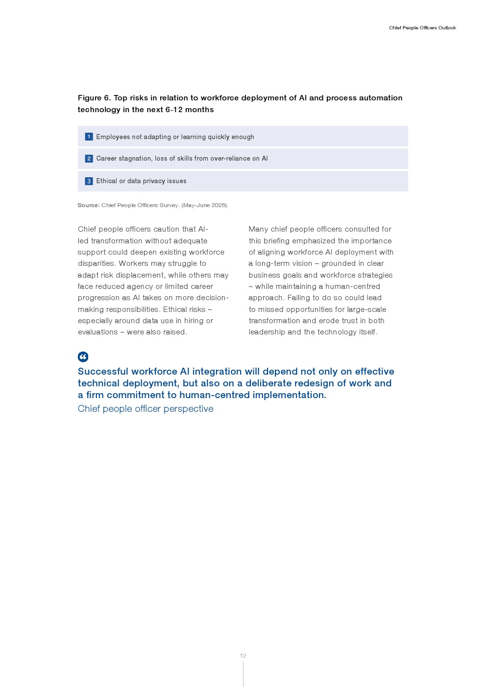 首席人力官认为,在劳动力转型的长期机遇中,短期劳动力市场存在谨慎情绪。未来一年的首要劳动力战略重点包括修订组织结构、培育文化和宗旨,以及推进劳动力人工智能(AI)部署。与AI相关的机遇具体包括工作增补与重新设计、职业发展、工作流程改进和技能提升。技能萎缩等风险依然存在。以人为本的劳动力AI部署至关重要。