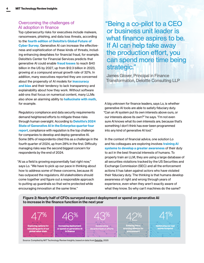 随着生成式人工智能(AI)技术的迅猛发展,财务职能正经历一场深刻的变革。根据德勤和麻省理工科技评论的调研,约有19%的财务组织已开始采用生成式AI,尽管其投资回报率(ROI)尚未完全达到预期,但近一半的首席财务官(CFO)预计未来一年内在财务领域的AI部署及支出将继续增长。生成式AI主要助力财务人员处理重复性、机械化任务,例如季度报告的起草、投资者沟通及战略摘要的形成,这使得财务专业人士能集中精力于更高价值的战略工作,从而提升整体组织的生产力和决策速度。