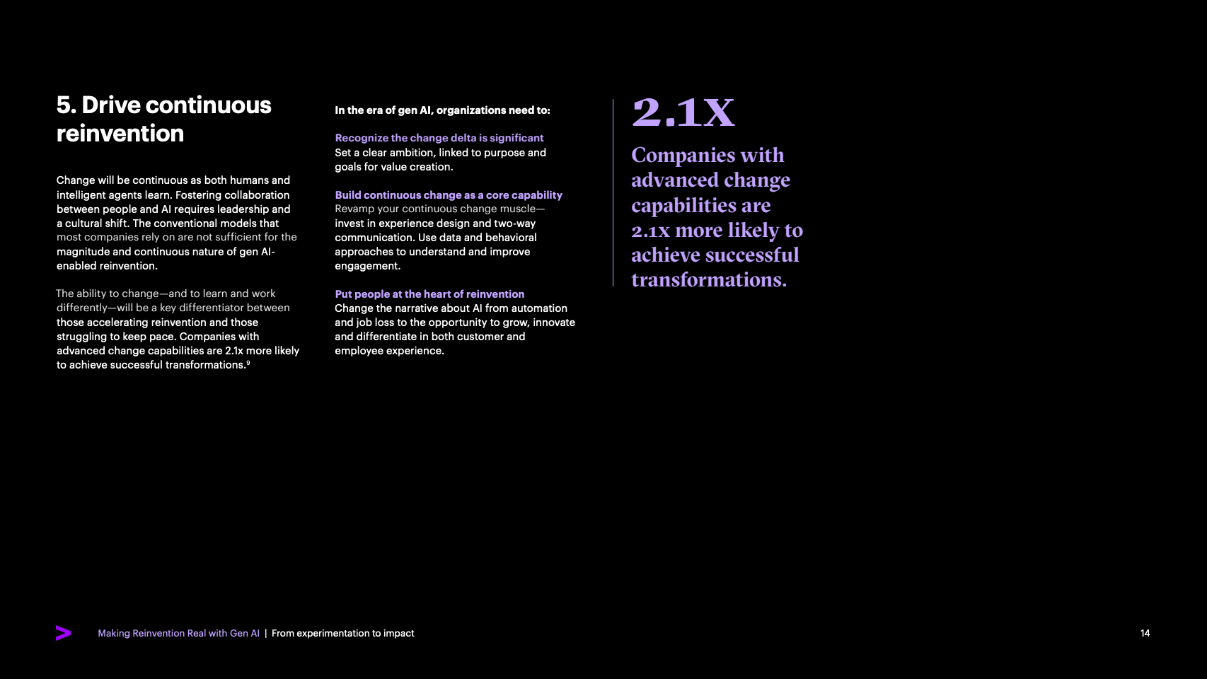 最后,持续性变革能力决定企业生成式AI转型的成败。拥有先进变革管理能力的企业,成功实现转型的可能性是他人的2.1倍。持续的双向沟通、经验设计和人本主义的AI文化是这一能力的核心。例如大型电子零售商将AI客服与人工智慧紧密融合,实现客户互动满意度显著提升,同时使员工工作效率和协同水平得到质的飞跃。
