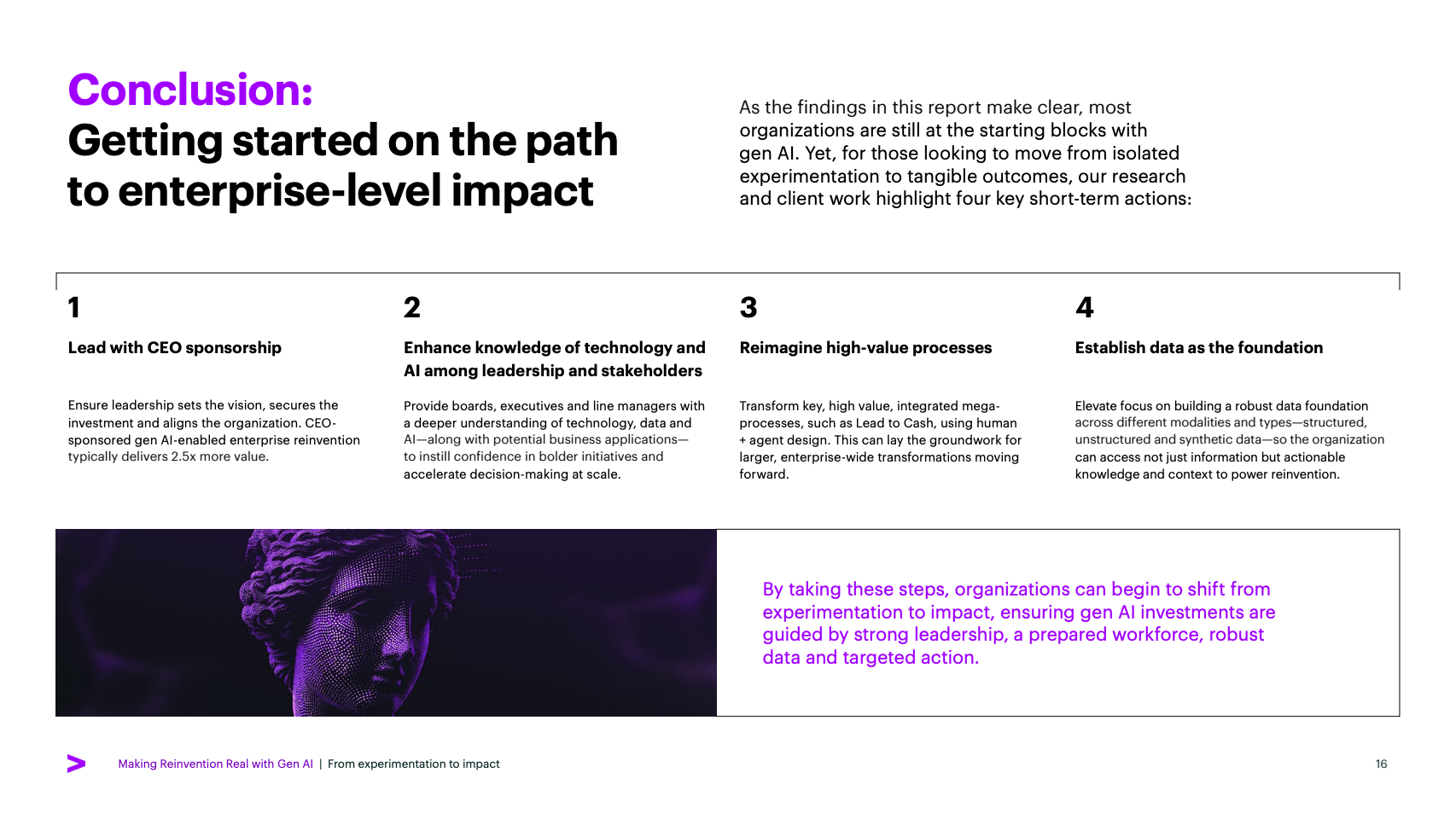 围绕价值驱动,企业须聚焦革新核心业务流程和整合跨部门协同,利用生成式AI“黑客”式破解流程壁垒,拓展新服务和渠道,实现端到端影响。例如,70%以上的生成式AI投资集中于IT、客户服务与市场营销,推动了技术交付、客户中心和个性化营销等领域的变革。在金融、保险及生命科学等行业,基于行业特点的生成式AI解决方案推广更为迅速,三分之一企业已成功规模化这些核心业务场景,ROI达到预期的三倍。未来,针对特定领域的小型语言模型和具备代理功能的架构将成为加速推动的关键技术,2025年计划投资的企业数量是2024年的三倍。
