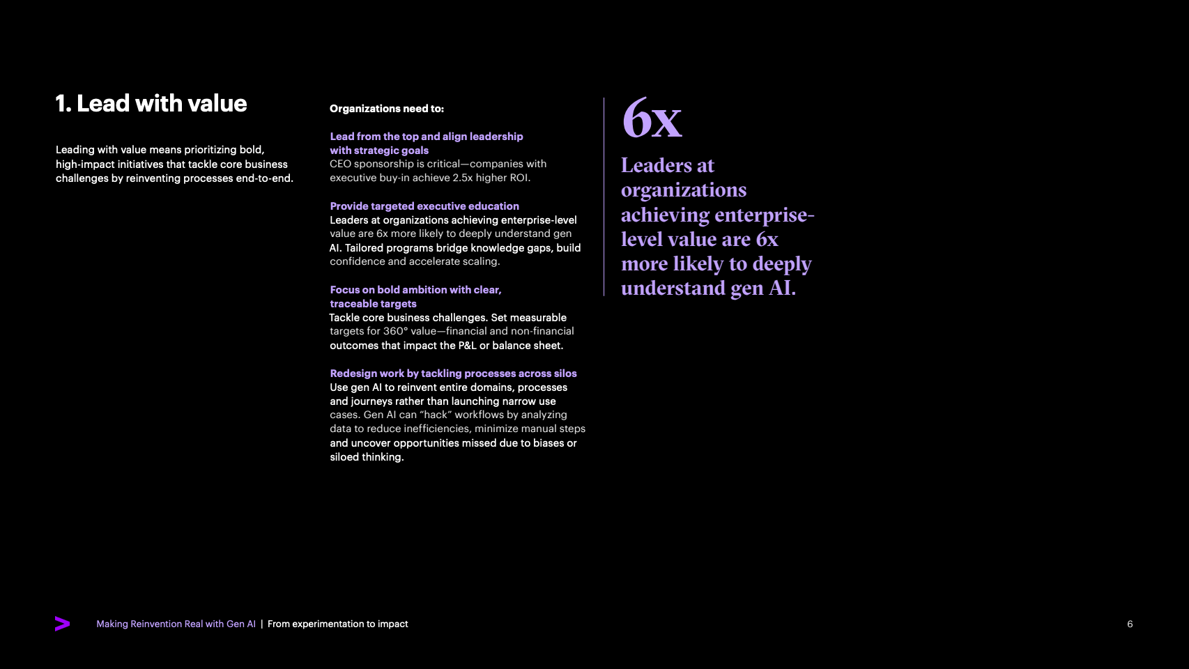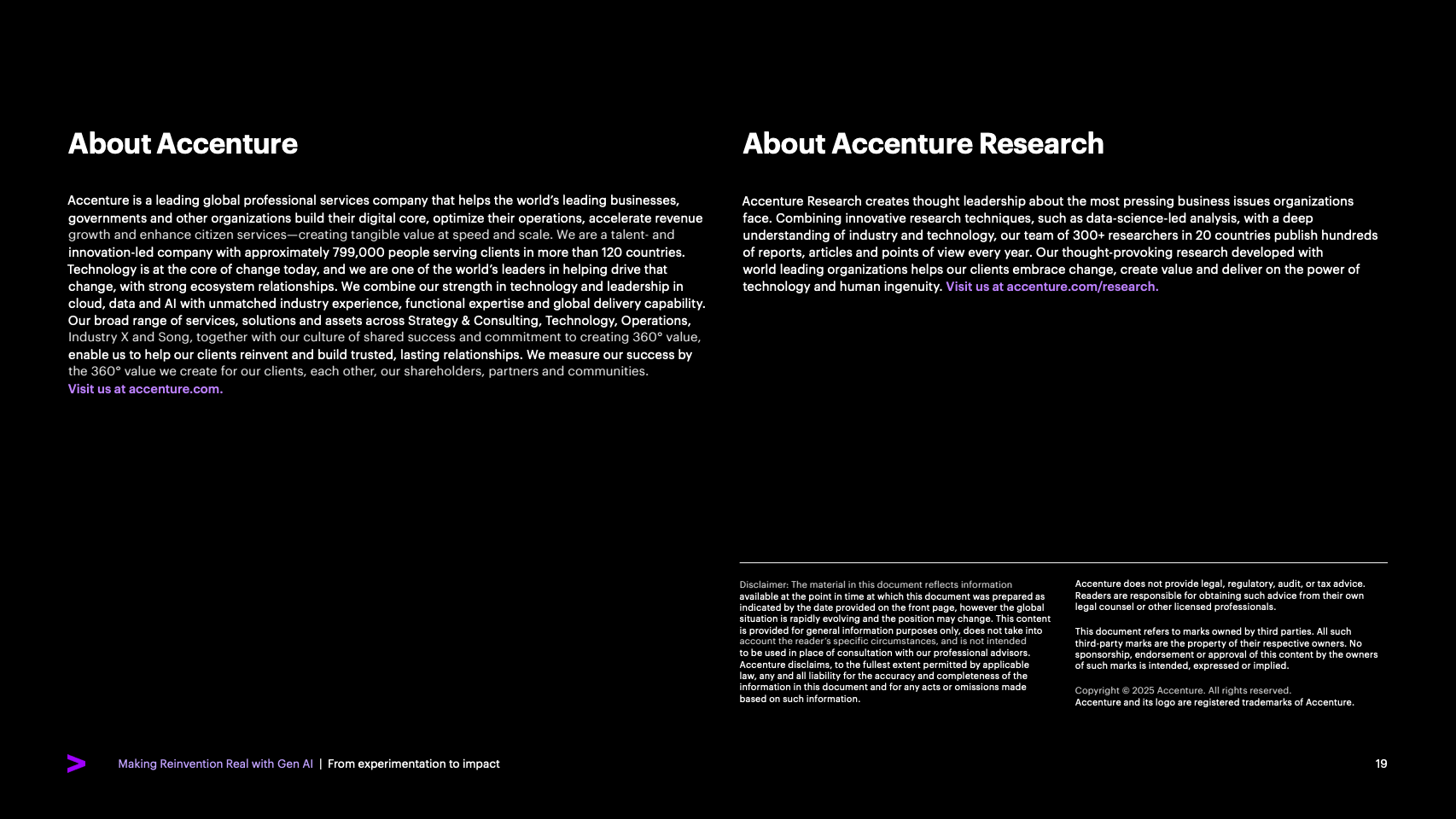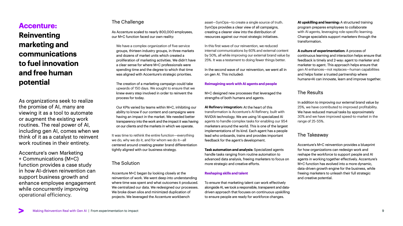 人才和工作方式的变革是实现生成式AI价值的核心。数据显示,企业在技术上的预算投入是人才的三倍,但唯有以人、技术和流程三者同步进化,才能真正实现转型。44%的工作时长预计将因生成式AI而改变,然而仅35%的企业有明确的生成式AI与人才重塑路线图。引入多层级AI代理,重构工作流程和岗位职责,并通过定制化AI学习提升员工能力,成为领先企业的共识。埃森哲营销与传播部门的案例显示,通过流程重塑与AI协同,手工任务减少约30%,市场响应速度提升25%至55%,外部品牌价值提升25%。