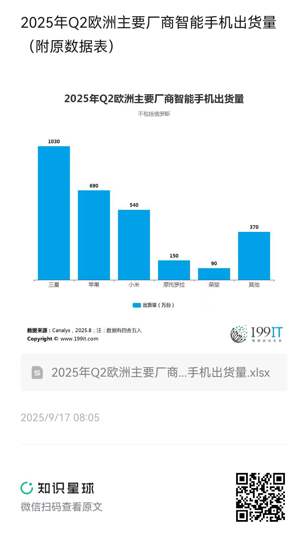 2025年Q2欧洲主要厂商智能手机出货量(附原数据表) ​​​