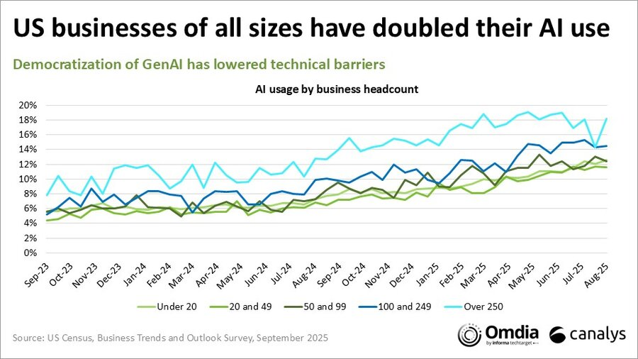 Canalys分析师Greg Davis表示:“在美国,人工智能在商业领域的应用取得了巨大成功,根据美国人口普查局商业趋势和前景调查,人工智能的商业采用在过去两年中增加了一倍多,仅今年的使用量就增长了50%。然而,今年夏天,我们看到,由于对陷入试点炼狱的担忧加剧,大型企业的增长速度略有放缓。随着企业开始在将人工智能集成到工作流程中遇到问题,支持人工智能的PC供应商必须展示其设备可能带来的增值。”